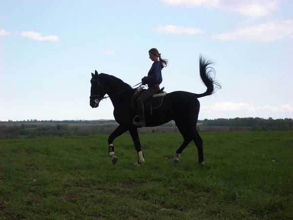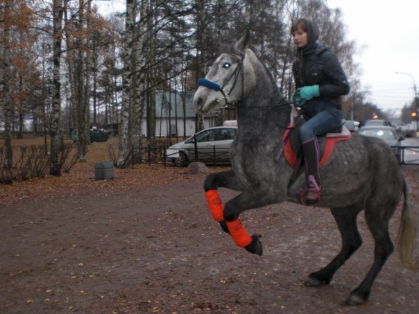Сейчас у нее жеребец тракен Юбер Аллес, великолепный мальчик, к сожалению попал к ней, хозяйка продала его после отравления кормами, боролась за него до последнего даже после советов ветврача:"Усыпить". Конь ушел от нее с ламинитом, новый хозяин продал уже его в Ад. Видела его относительно недавно - от коня не осталось ничего. Зимой он 2 недели ходил на работу на 3 подковах с шипами. Да много каких ужасов было, не говоря про прыжки с больными ногами. Лошадей на этой конюшне если и кормят, то только перед поением. Света пожимает плечами:" А какая разница?". Из-за диких условий содержания у коня треснули копыта. По словам оцевидцев, конь сейчас еле ходит. Раз его не отправляют на работу, значит все очень плохо.