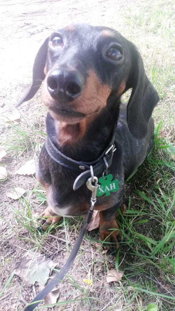 Утром, пытаясь поймать таксовый ошейник в перчатках - он вертится на шее, хоть и сидит плотно, и каждый раз кольцо надо поворачивать, чтобы пристегнуть рулетку, вспомнила наш разговор - куда там табличку...