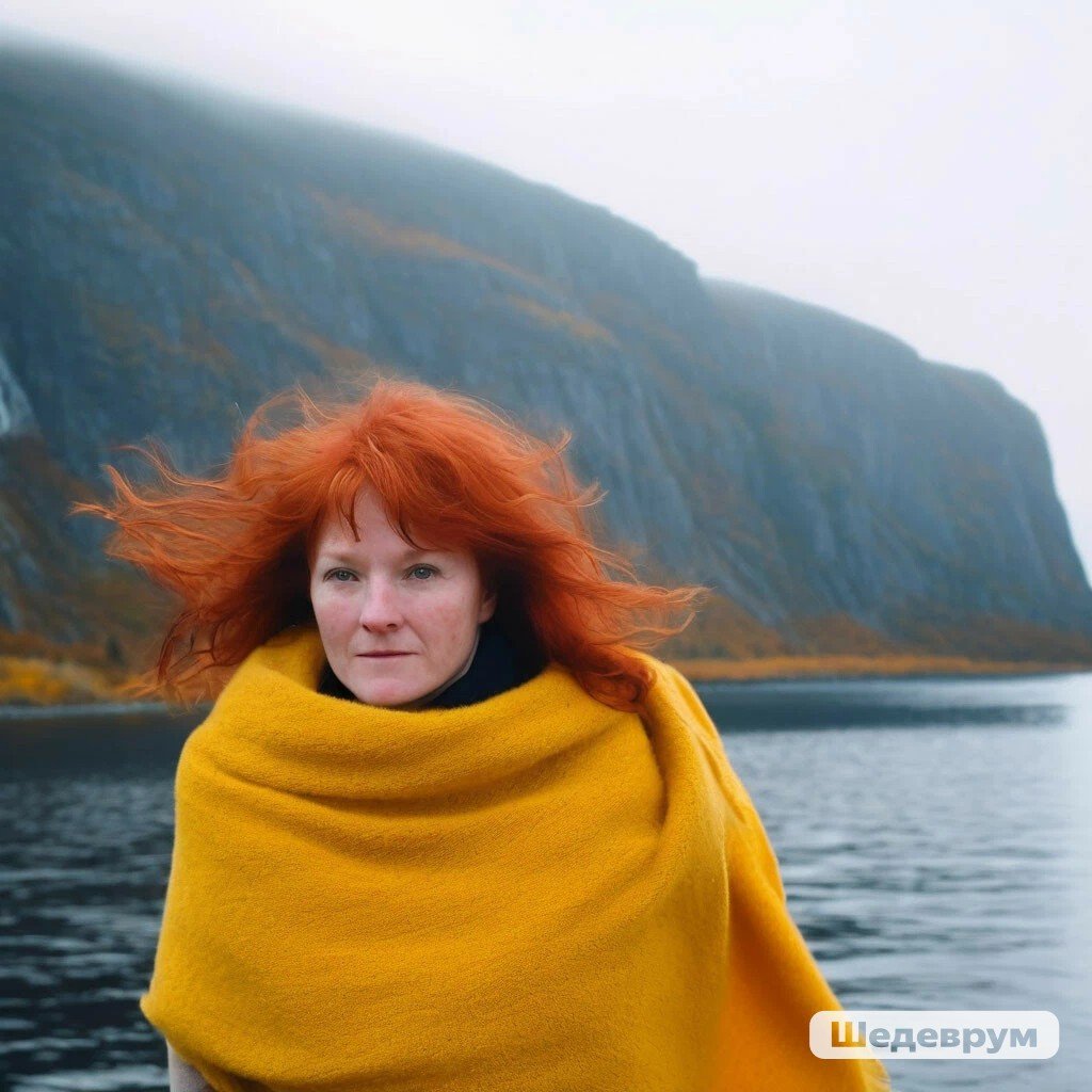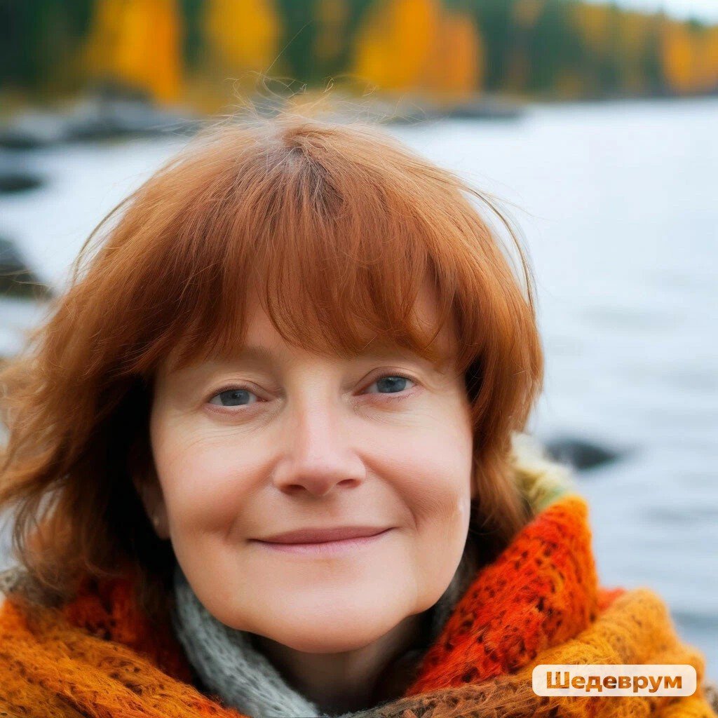 Потом я взяла эту картинку и на ее базе сделала свое реалистичное фото в шарфе на берегу. И, о чудо, ИИ сделал именно мое фото, черты лица и выражение мои. Хотя тоже сильно облагороженное.