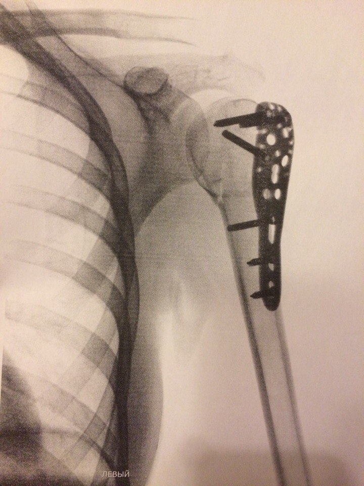 Скорая ехала 40 минут. За это время я практически полностью вырубилась от боли. По приезду в больницу врач сказал, что необходима операция, иначе рука останется в нерабочем состоянии. На операции мне поставили железную пластину на шурупах (см. снимок), шрам около 20 см. почти на все плечо. Месяц в больнице и часы адской боли. Затем несколько месяцев рука не двигалась и через боль ее приходилось разрабатывать, потому что за время подготовки и проведения операции мышцы полностью атрофировались.