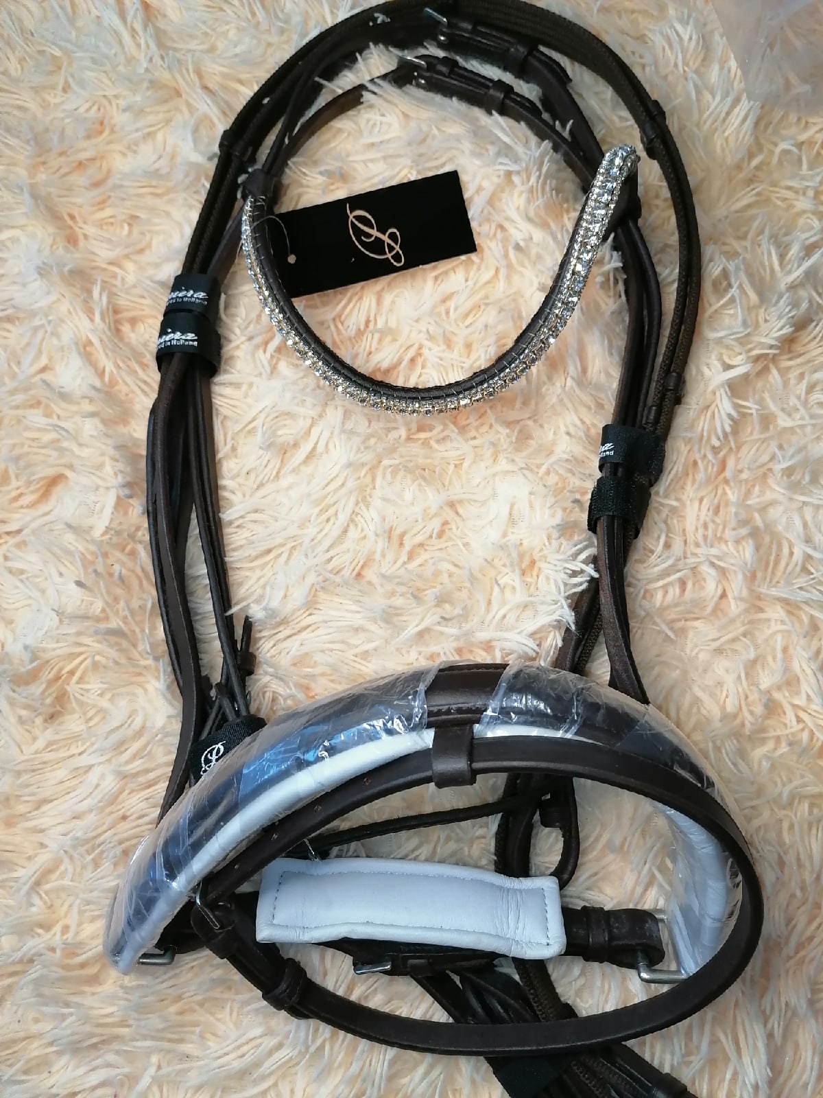 4. Состояние: новый. Коричневая кожаная уздечка с поводом от Premiera модель "Valentia". Размер коб. Белая подложка, самозатягивающийся капсюль и шикарный налобный. Цена 7 500 р.