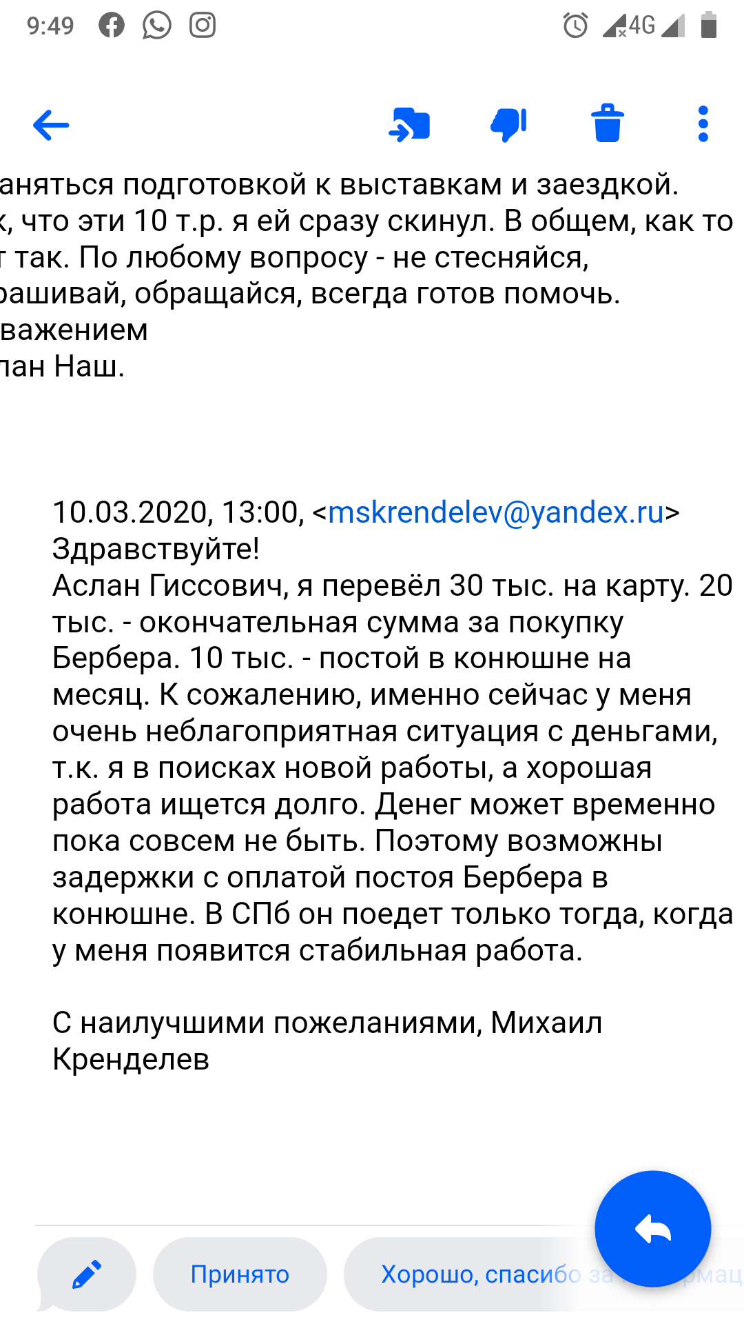 Первое впечатление- ребенок, экстерьер только начал меняться с жеребячьего, немного грязный тк в поле, шерсть длинная, с зимы не вылинял, а я все таки в спорте и привыкла к чистоте, в общем стала думать, расспрашивать Аслана что да как, советоваться со знакомыми. Аслан отвечал на все вопросы, долго разговаривали, да и Самоволов порекомендовал, а это дорогого стоит... Согласилась.