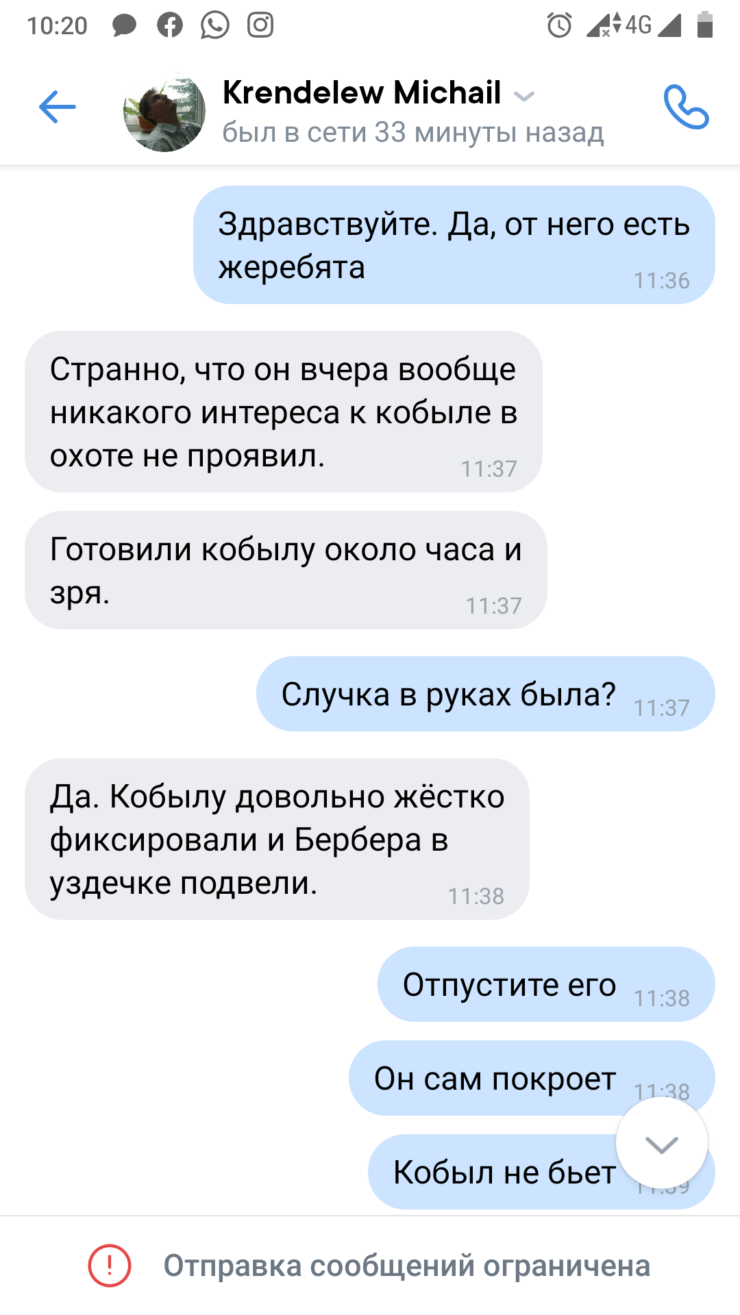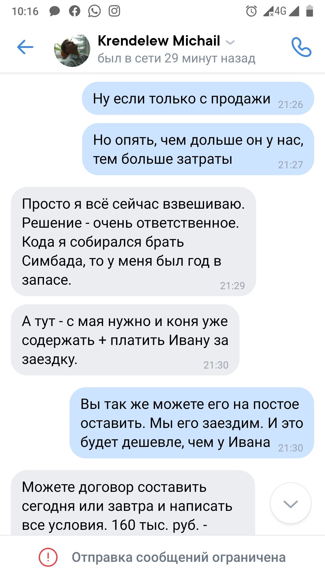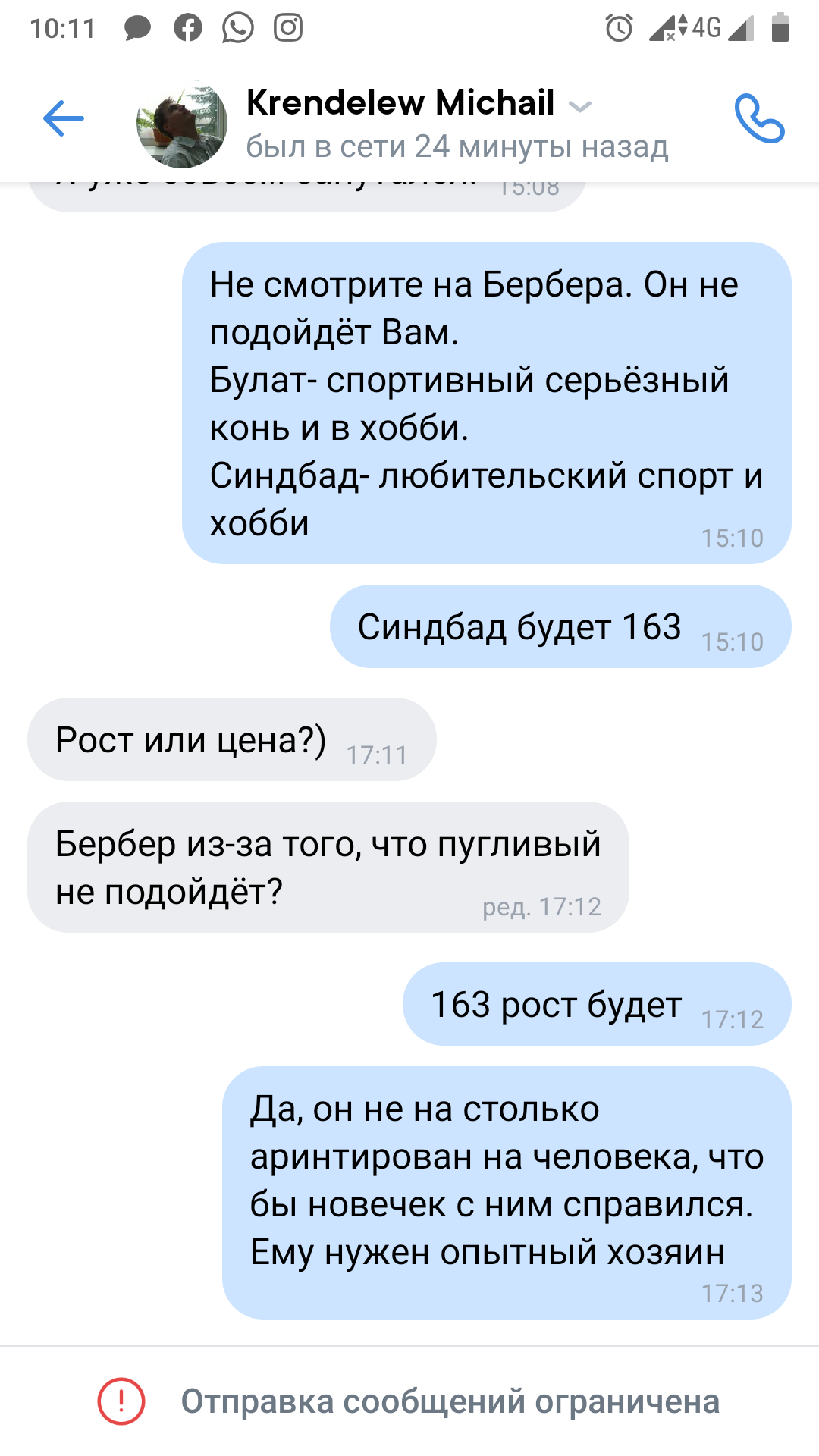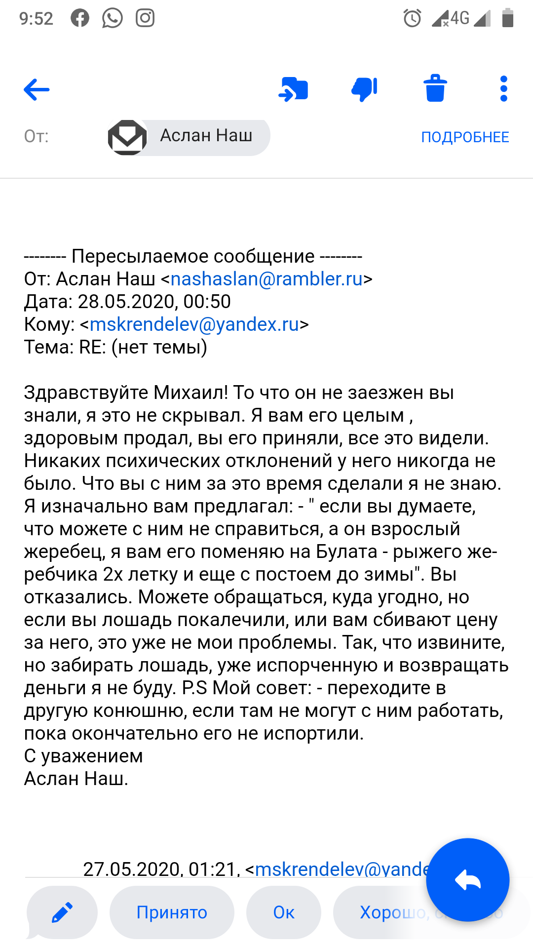 Все переговоры вёл Аслан, сам ездел для меня ,сам смотрел, сам вёл диалог с хозяином. Мне отправлял фото и видеоотчёты, потом решали...как быть. К сожалению, а может и к счастью с кобылой не сложилось. На стандартные вопросы о документах и прививках ответа не было, прозвучало только хочешь- забирай, нам все равно! Не хочу...