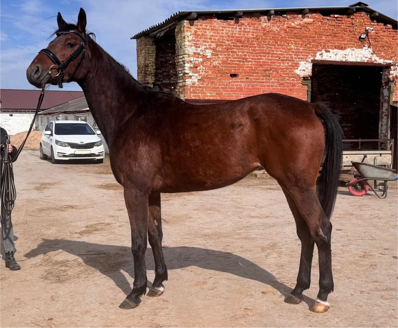 Адекватная молодая лошадь в стадии заездки. Подсаживались, отнеслась совершенно спокойно. Находится в легком тренинге.