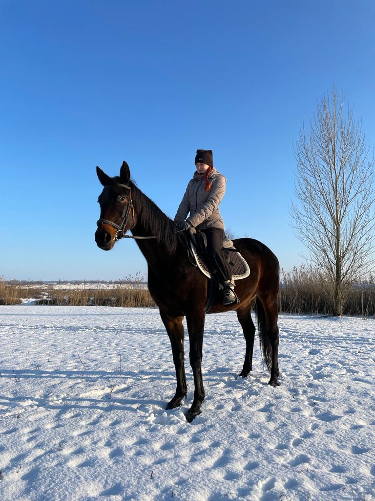 - Кобыла - Омалия, тракененская порода, темно-гнедая масть.