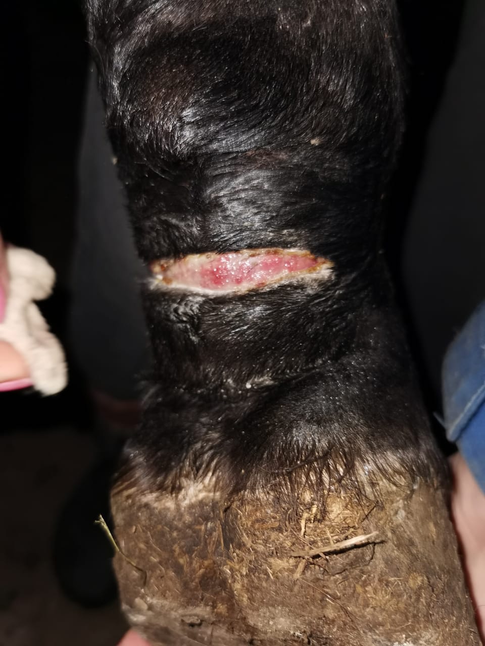 Лошадь спасли из плохих условий. По рассказам очевидцев запуталась в веревке, испугалась и порезала себе кожу на путовом суставе.