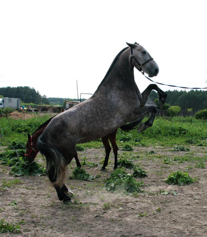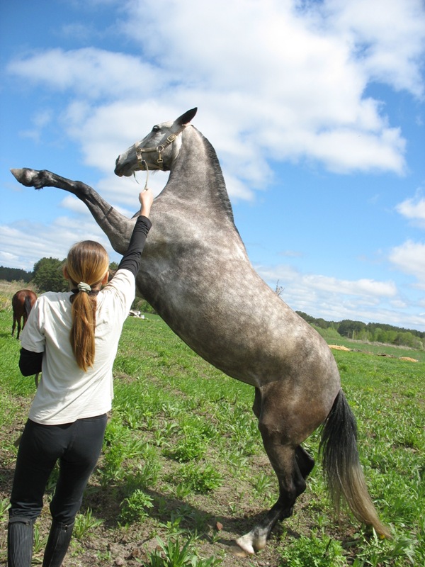 Kana_Kana, что-то я не вкурила, зачем вам его учить вставать на свечку :shock: Там и так проблем хватает. У Парелли первая игра какая? Дружелюбная! Она самая важная, нужная и полезная. Вся эта возня с веревочкой выглядит со стороны ужасно смешно, особенно если лошадь не шугливая и спокойно воспринимает все эти махания веревкой, но ее незаслуженно игнорируют и часто пропускают. А 1-2 минуты занятия этой "ерундой" дает потрясающий эффект в плане взаимного доверия :wink: Все эти уступки давлению, осаживания, поднимания ног - всего лишь внешние проявления взаимного внимания, доверия, уважения. Проблема на корде именно от недостатка этих трех компанентов. Вы друг друга боитесь, ни о каком уважении речи не идет, все внимание сосредоточено на 2х вопросах: "как бы мне не наваляли" и "как бы успеть навалять до того, как наваляют мне". Не очень понимаю, чем здесь может помочь обучение свечкам.