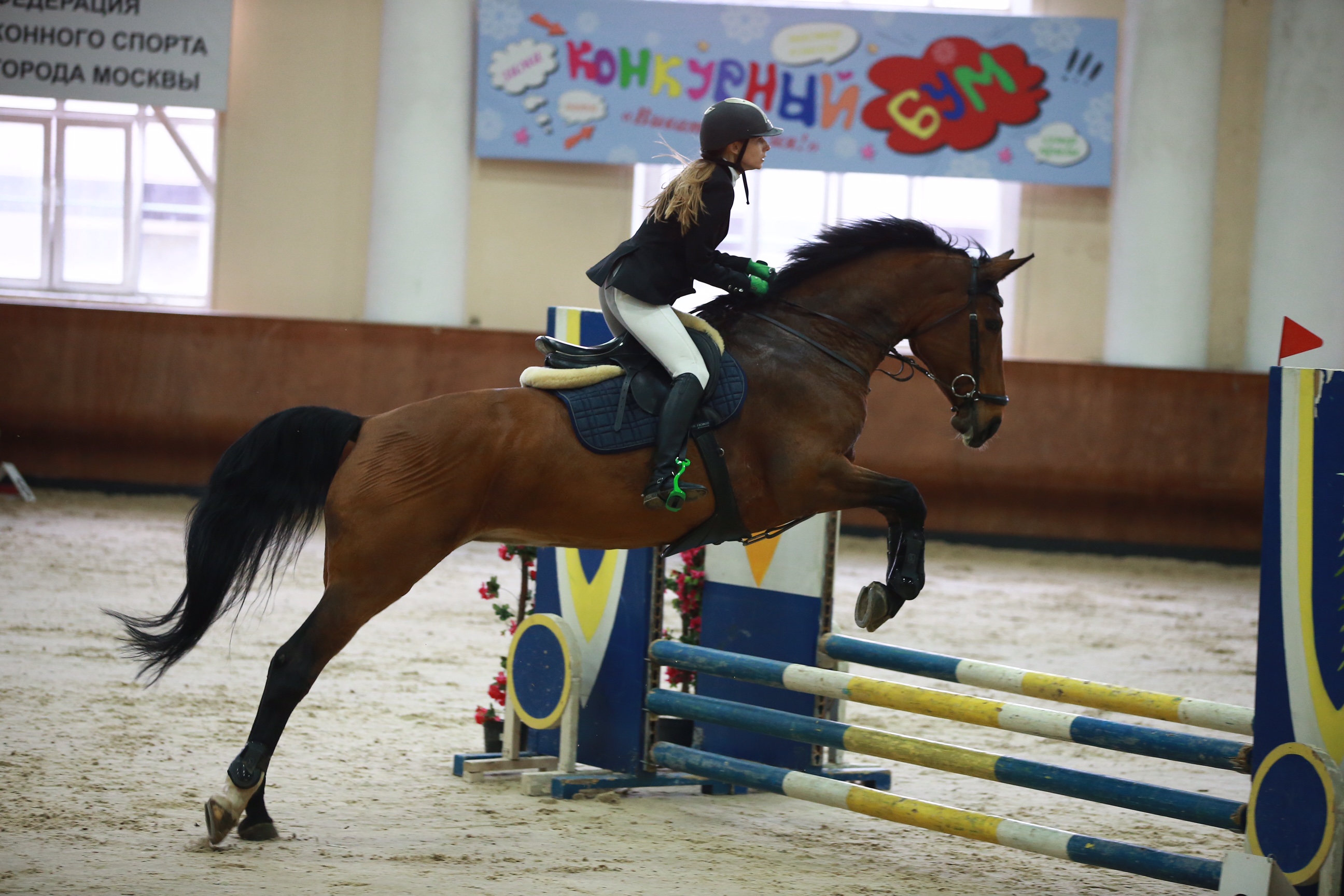 Регулярно выезжаем на старты. Тренирует мастер спорта по конкуру.