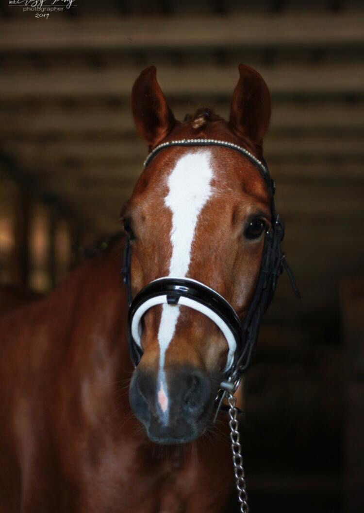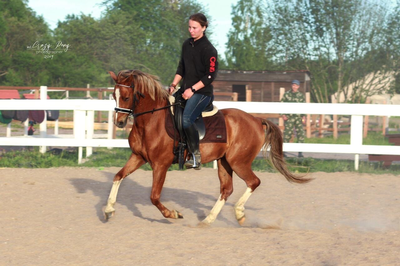 Хорошо управляется, прыгает под всадником 80 см, в шпринте 110 см.