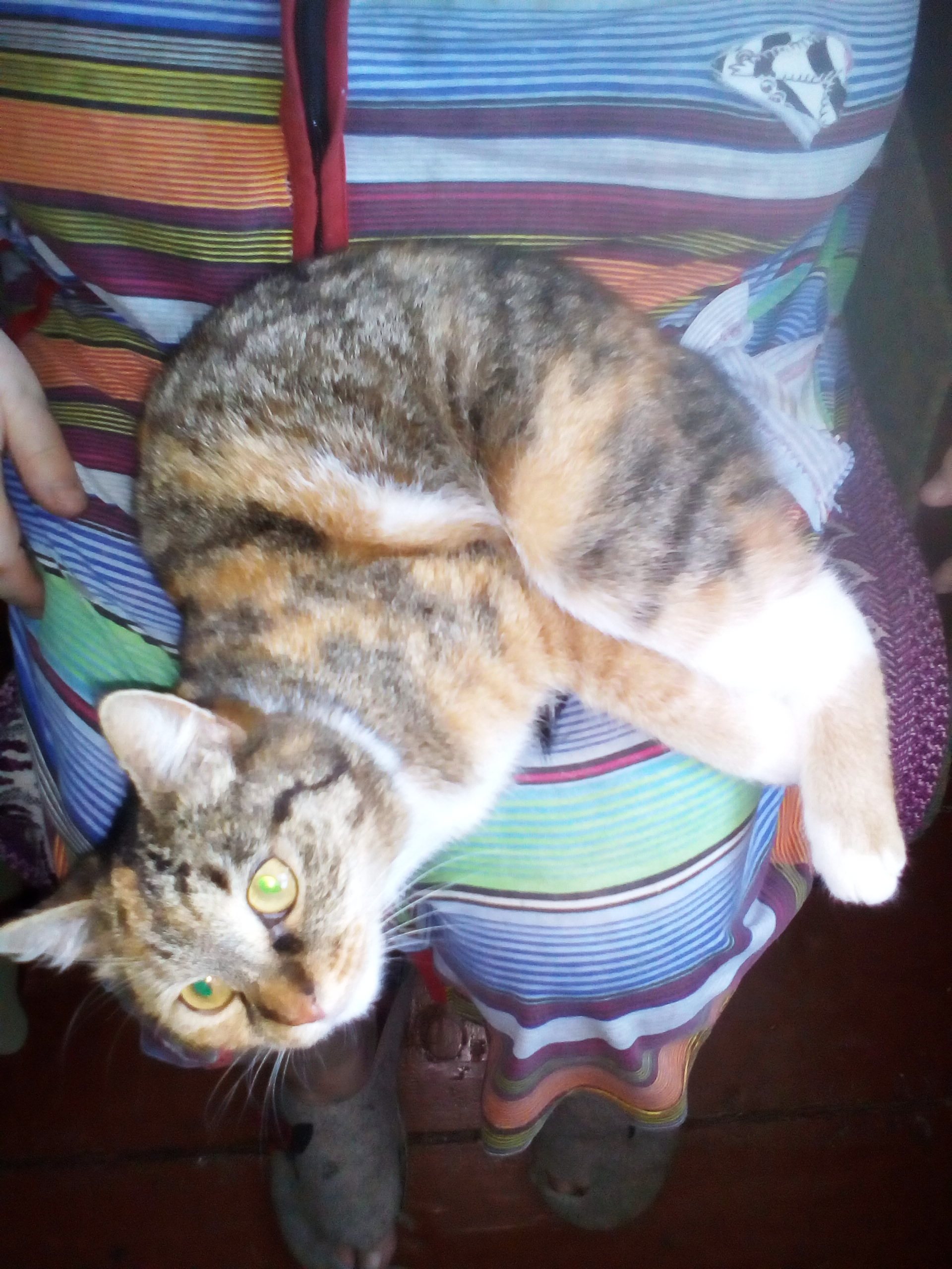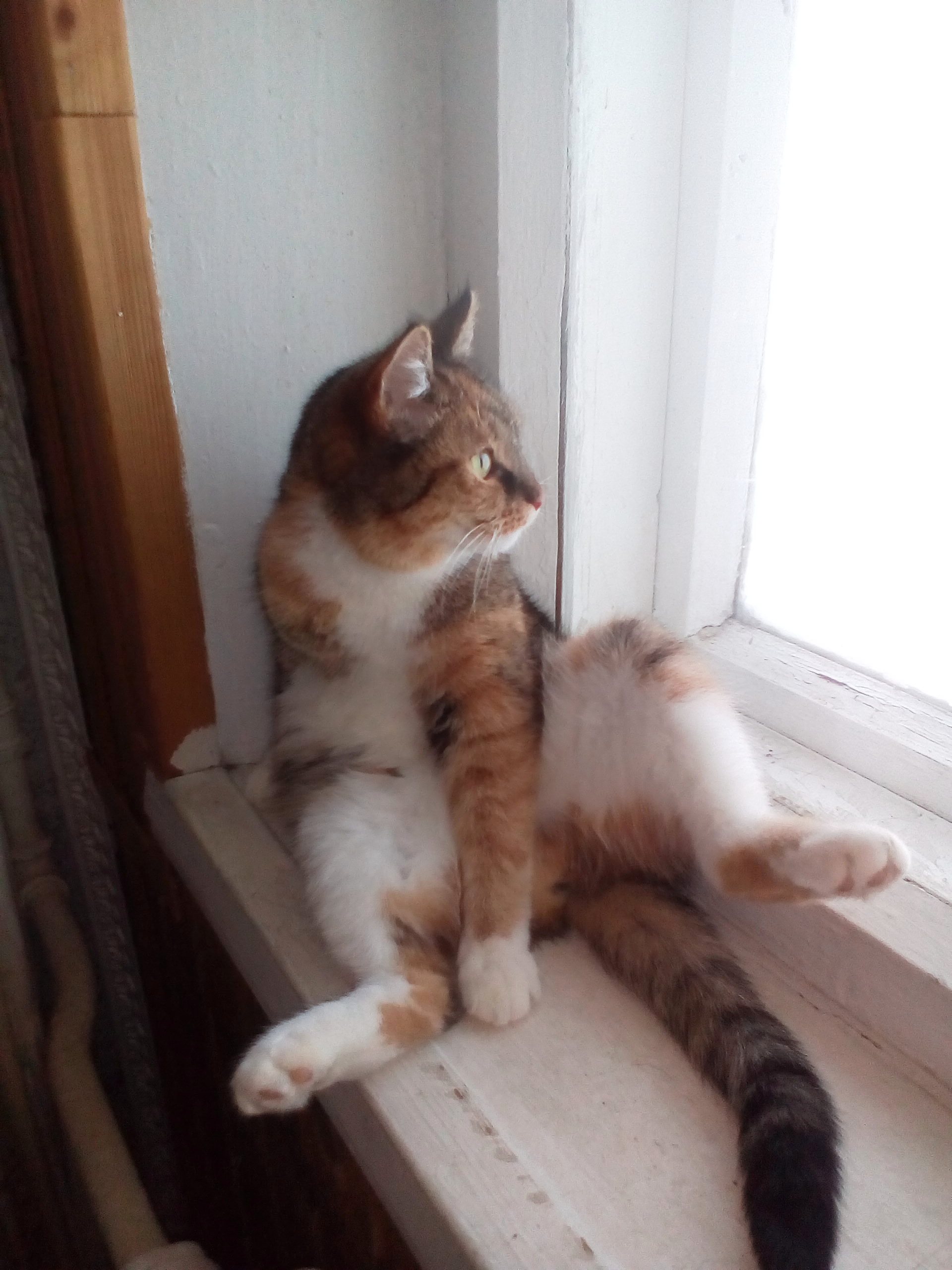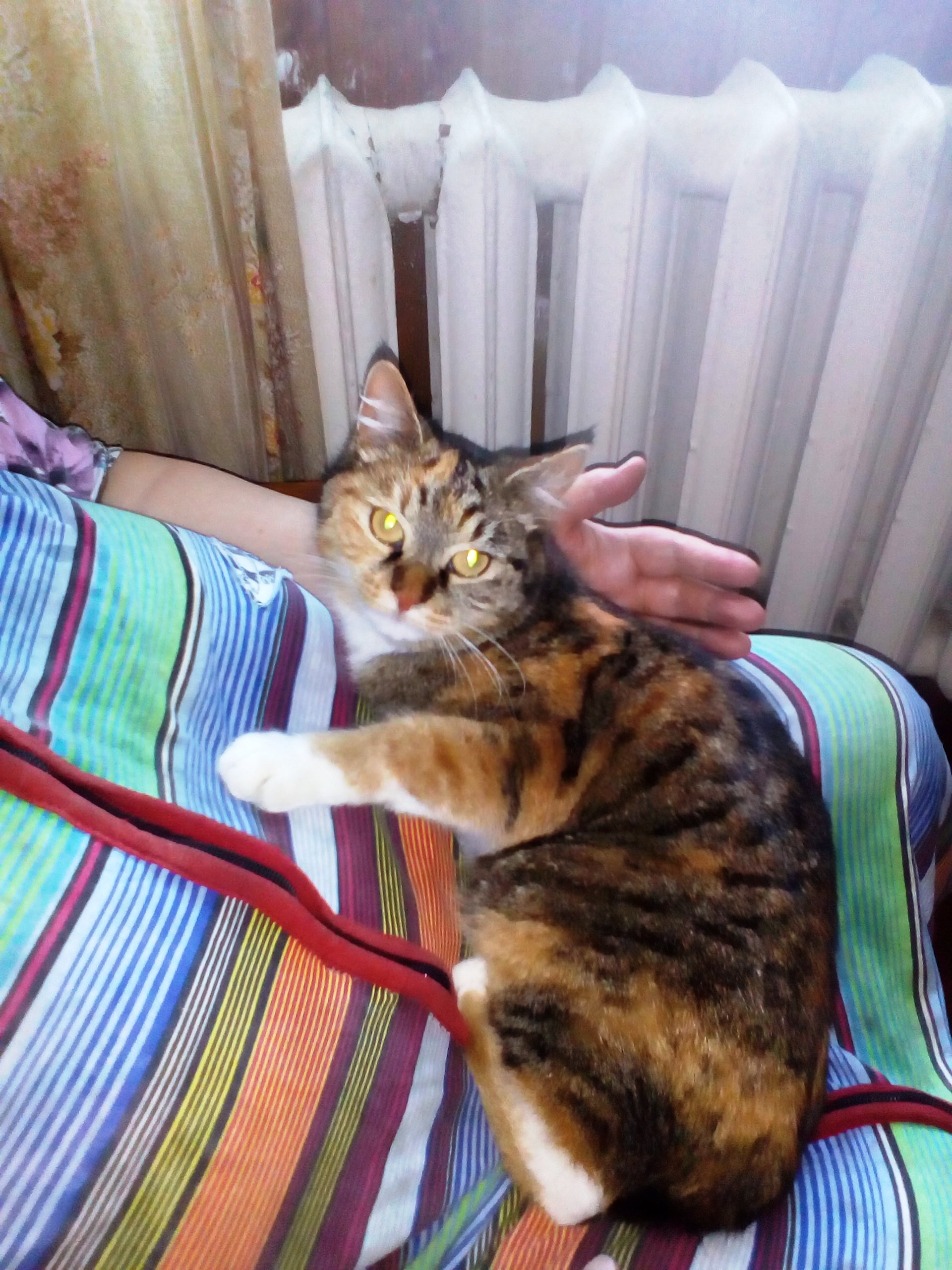 Трехцветная кошечка была подобрана еще котенком этими людьми. Сейчас ей около 2 лет (не больше 3).