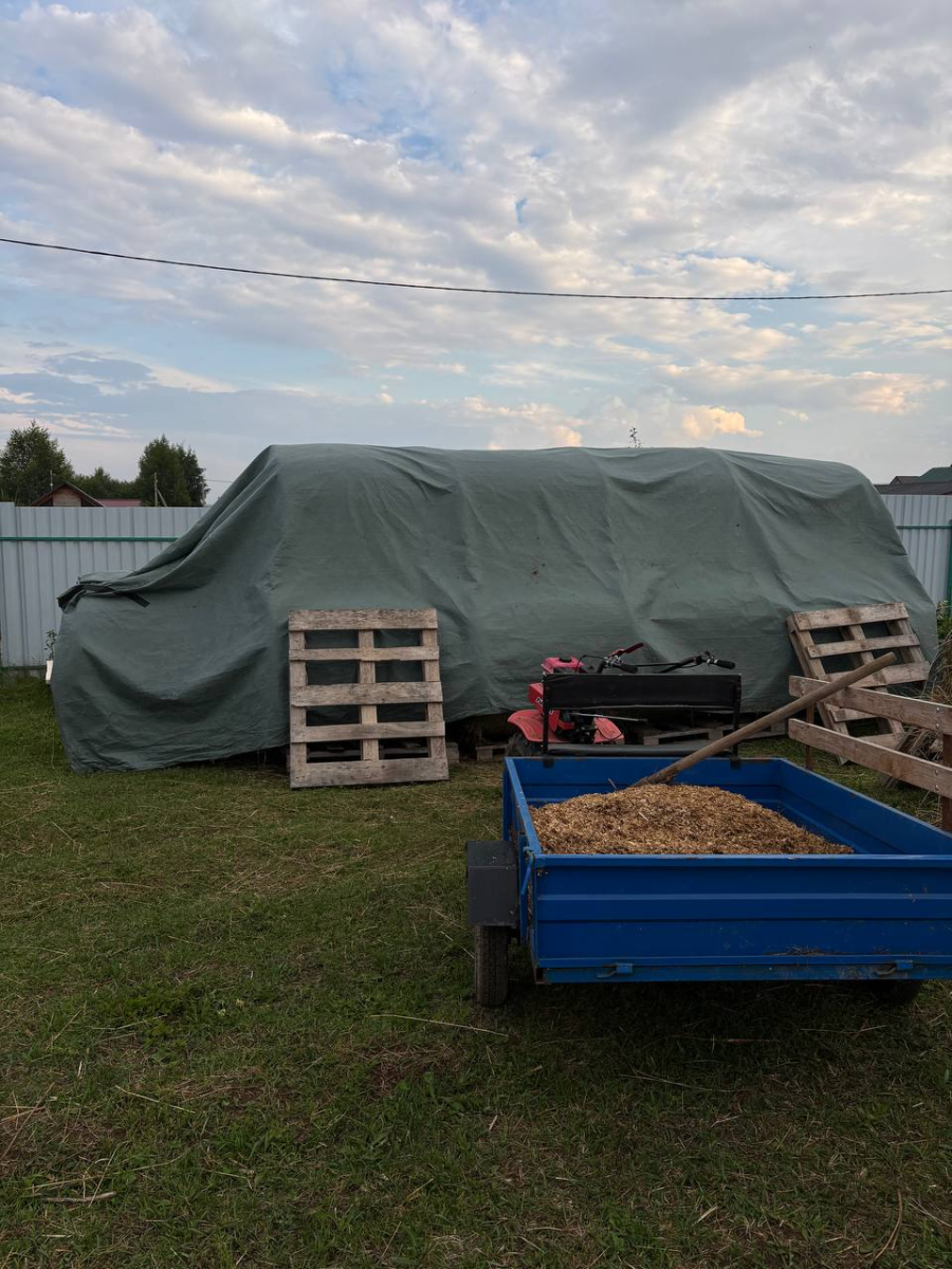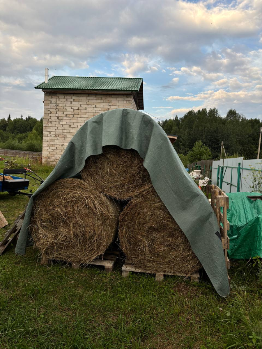 Купила такой для укрытия сена. Полотном укрыли "пирамидку" из сена. Чтобы все работало и вода скатывалась, обязательно нужно складывать сено пирамидкой. В таком виде сено хранилось всю осень, зиму и весну.