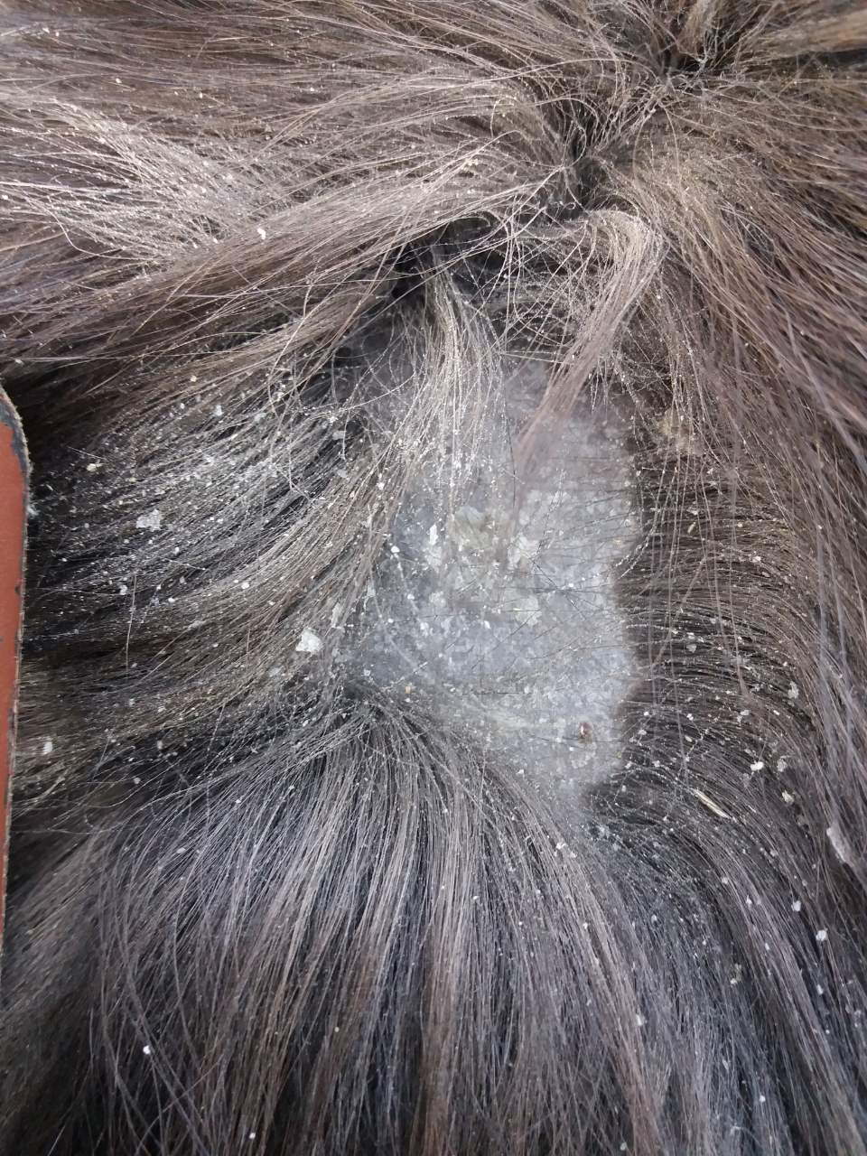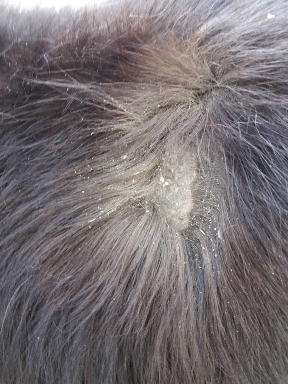 Доброе время суток! Нужен совет! Около месяца назад мы привезли мини тинкера и ей было на тот момент 6-7 месяцев (сразу после отъема). Говорили, что ее гнобили в табуне свои сородичи и постоянно "тумкали". Вчера, при очередной чистке,я обнаружила вот такую проплешину за холкой на спине и сейчас в смятении,что это? Когда в этом месте начинаешь чистить,она пытается укусить и еще, ей очень нравится когда ее чешат на шее и в области груди между передних ног(в этих местах таких лысин нет).