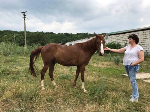 Масть: рыжий, на задних ногах белые носочки, на спине и бедре чип буденновского завода.