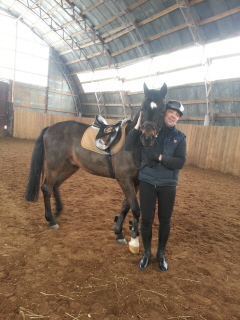 Маркиса, я вселенское ссикло :lol: в ДЮСШ к Травушке я привыкла и она умница, замученная прокатом делает все сама. Она не очень быстрая и комфортная, даже когда вредничает. Кладу немного фоток, я с Георгиной и муж (как его лошадь зовут не помню, длинно как то) Георгина-это область! Ездили мы сегодня в 4 раз к ней, ее я откровенно боюсь, ну не так конечно чтоб не лезть, но.......Гера раньше до травмы ездила на соревнования и бежит она быыстро, ну может конечно мне это кажется из-за небольшого манежа.Моя главная цель на Гере не вылететь еще на рыси (ну не знаю, кидает меня и все!) Прошлое занятие пробовали галоп на корде-кооооошмар! Так что сегодня я ехала в твердой уверенности пробовать самой галоп-без корды! Рысили мы хорошо, поделали восьмерки, серпантин, вольтики и настал час Х :cry: И конечно, я моментально забыла для чего мне ноги и как держать пятую точку в седле....и на повороте стала тупо падать. Мне что-то кричала Соня, чего я не очень поняла... Потом я вспомнила, что у меня есть, хоть и не очень крепкие, но ноги и они должны лежать правильно, а не теллепаться в разные стороны, короче я усидела, остановилась, походила и снова галоп, лучше, так что есть надежда в ближайшем будущем перестать боятся. Соня хвалила, что падая я не цеплялась за повод и не висла на нем. Как ни странно руки у меня остались в правильном положении, с ногами хуже :evil: Ну и ладно, все равно мы с Герой молодцы! :mrgreen: на рыси вообще сидела прекрасно и спина и руки и ноги хи-хи-хи только Соня сказала что мы несколько лениво ехали.