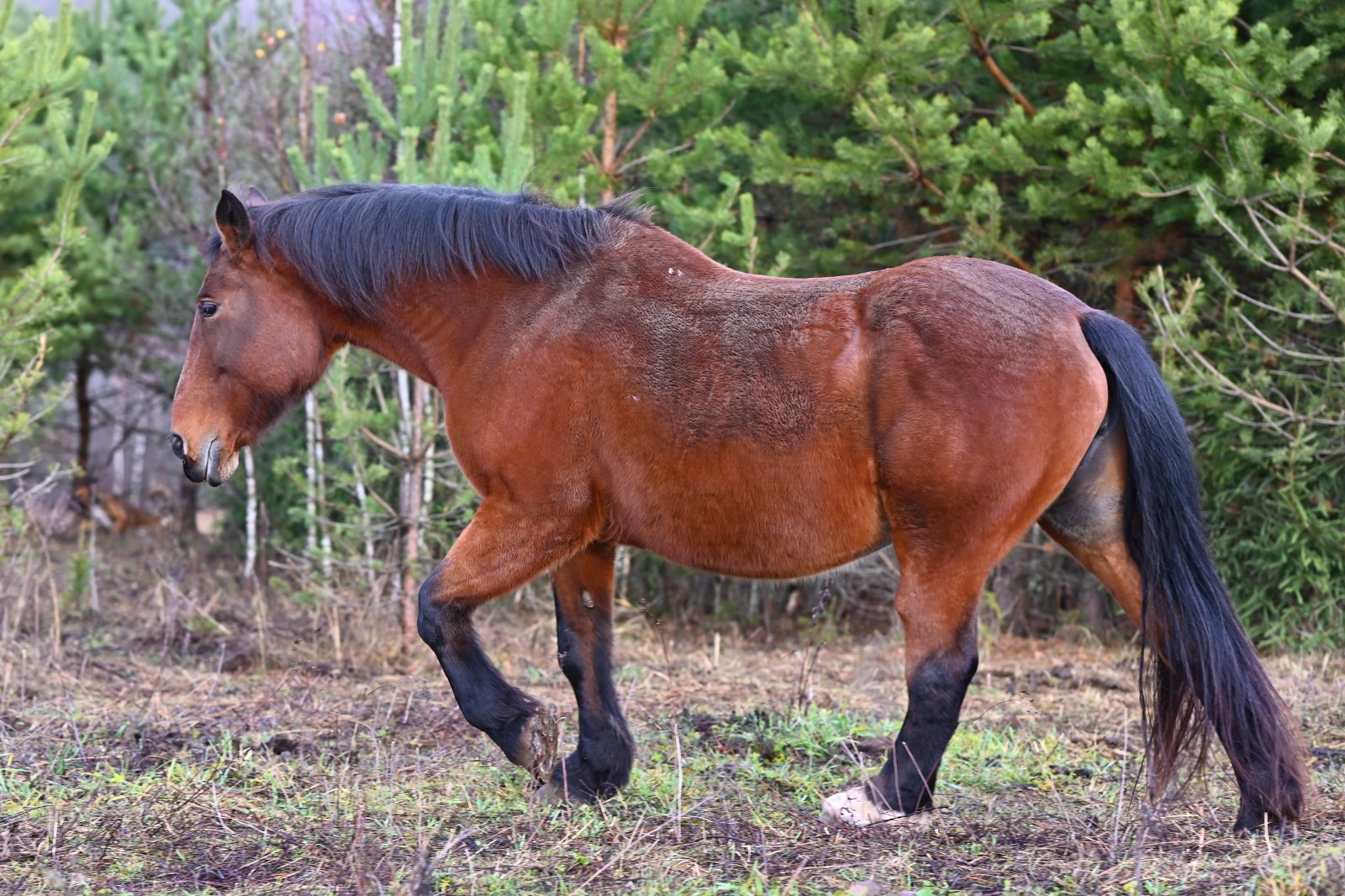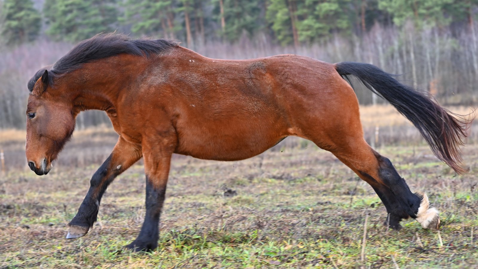 Гнедая кобыла, возраст точно неизвестен, по зубам примерно 2008-2010 г.р., ~160+ см в/х. На одной передней ноге козинец, скорее всего приобретенный, на него не жалуется.