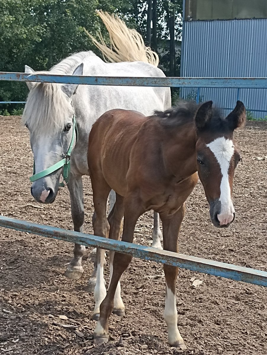 Я не приняла к сведению, не думала что может отразиться на лошади. Кобылка была молодая, всего лишь 2 года. Была там часто, лошадь моя гуляла в электропастухе, а когда была в охоте, была в железной леваде, откуда сама выбраться не могла. В сентябре, когда этого молодого конюха уволили, второй начал смеяться и казалось бы шутить о том что мою кобылу покрыли!!! Я очень переживала, но понимаю что лошадь в охоте, отпускала мысли о том что она может быть жеребая. 13 марта 2022 года я забрала оттуда лошадь по личным причинам. 3 мая 2022 года я увидела вымя, которое уже начало наливаться. После этого запаниковала, ведь лошадь буквально несколько дней назад вышла из охоты. Ладно, думала, может какой гармональный сбой или ложная жеребость. Через неделю увидела толчки в животе, и тогда уже начала всячески понять жеребая или нет, с утра пораньше после поения прижимала руку с левой стороны в области паха, и чувствовала точные пинки в руку и в ухо(слушала живот), наблюдала за движениями плода, который по итогу там и был. Мысли перепутались, написала начкону бывшему, скинула фото, видео, на что меня начали поздравлять и говорить что ничего страшного, в 2 года кроют и ничего(а хотелось бы услышать просто извинений, я не просила денег за ущерб или ещё чего-то). Ладно, отношения у нас были хорошие, не хотелось портить, ведь в любой момент могла бы обратиться за помощью. И так, уже 4 июня, живот поднялся, петля расслабилась, кобыла встаёт растопырив ноги, выгнув поясницу и мигает петлёй. Я думаю, ну всё, рожает, завела её, постелила большой слой соломы, а под него опил. Осталась ночевать в комнате отдыха, лишь дважды за ночь потихоньку подкрадываясь подглядеть за кобылой. Ничего не случилось. 9 июня. В 20.20 мне звонит хозяйка домашней конюшенки где жила Адель(кобыла), говорит, с выпаса забрала, у неё из петли висит слизь, она поднимает хвост и гугукает, поставили в леваду. Проходит 10 минут, мне звонят и говорят что родила, принесли воды, пошли накладывать кашу, принесли, а там уже 2 лошади лежит. Ожеребилась сама, за 7 минут, послед вышел сразу сам, целый! Жеребёнок родился крепкий, крупный, не смотря на то что кобыла молодая, на момент выжеребки было 2 года и 11 месяцев. Несмотря на это, кобыла сразу начала вылизывать, ни разу не огрызнулась на ребёнка,кормит,защищает, инстинкты работают на 110%.