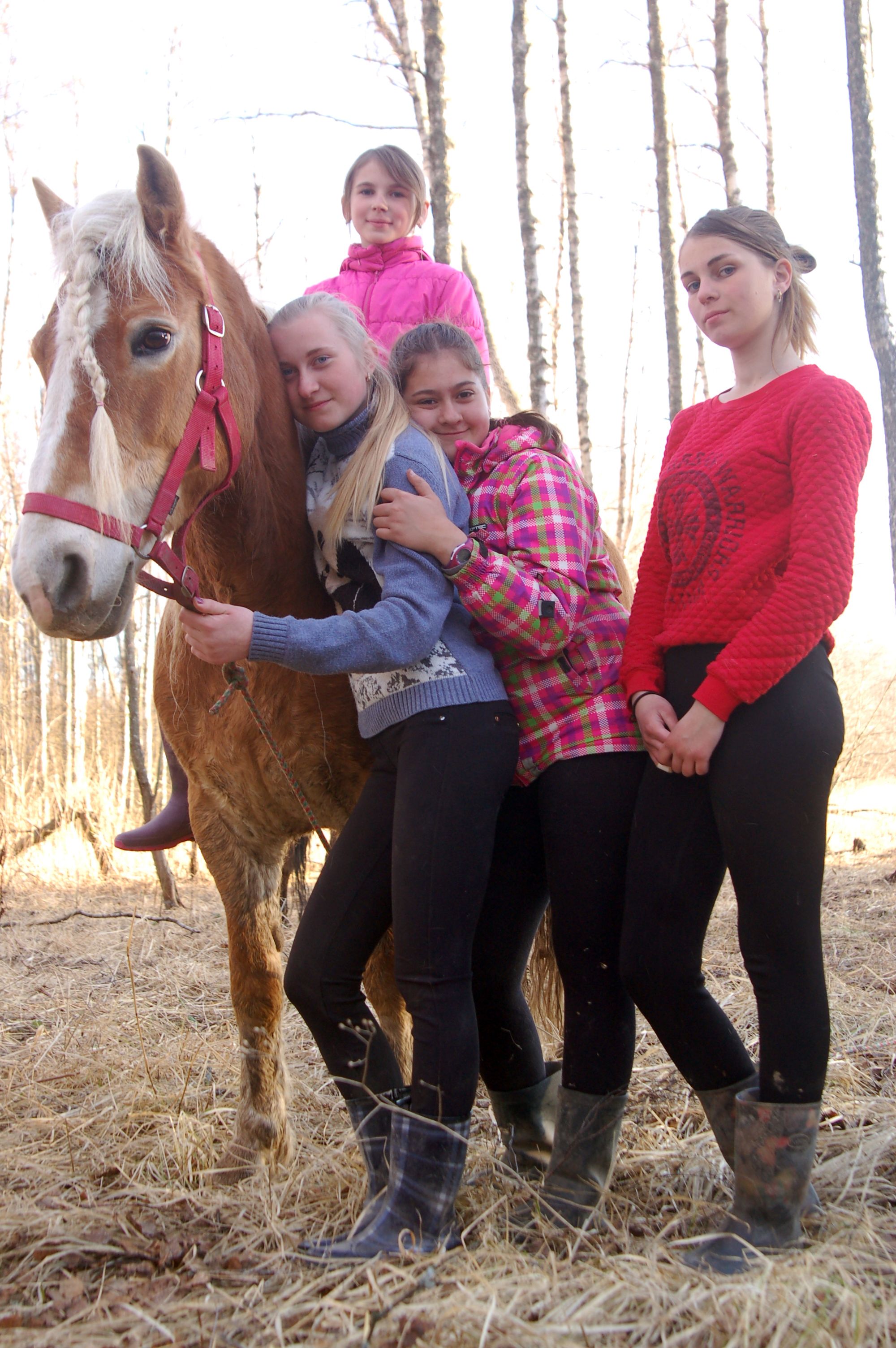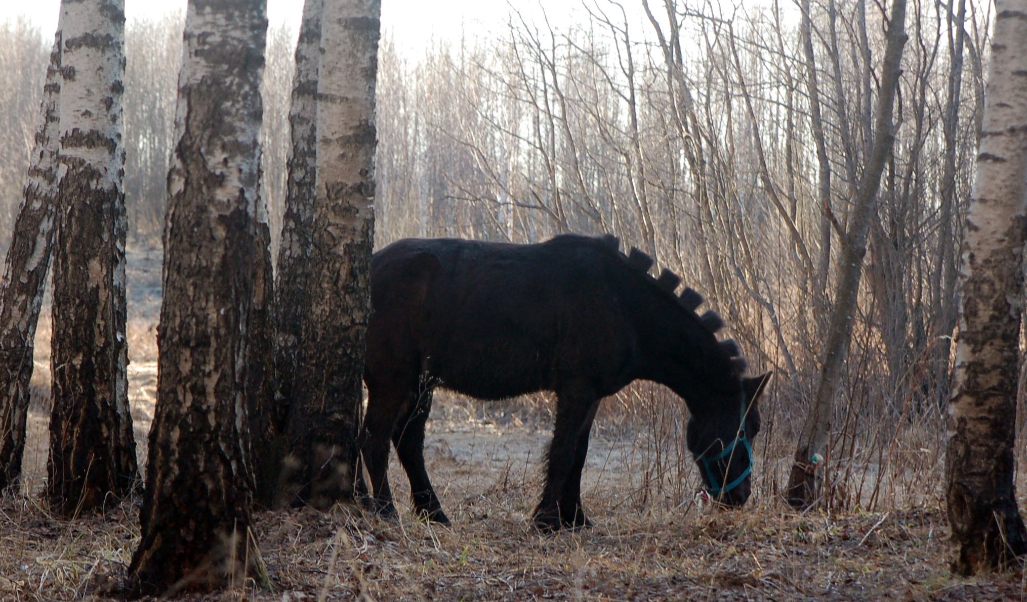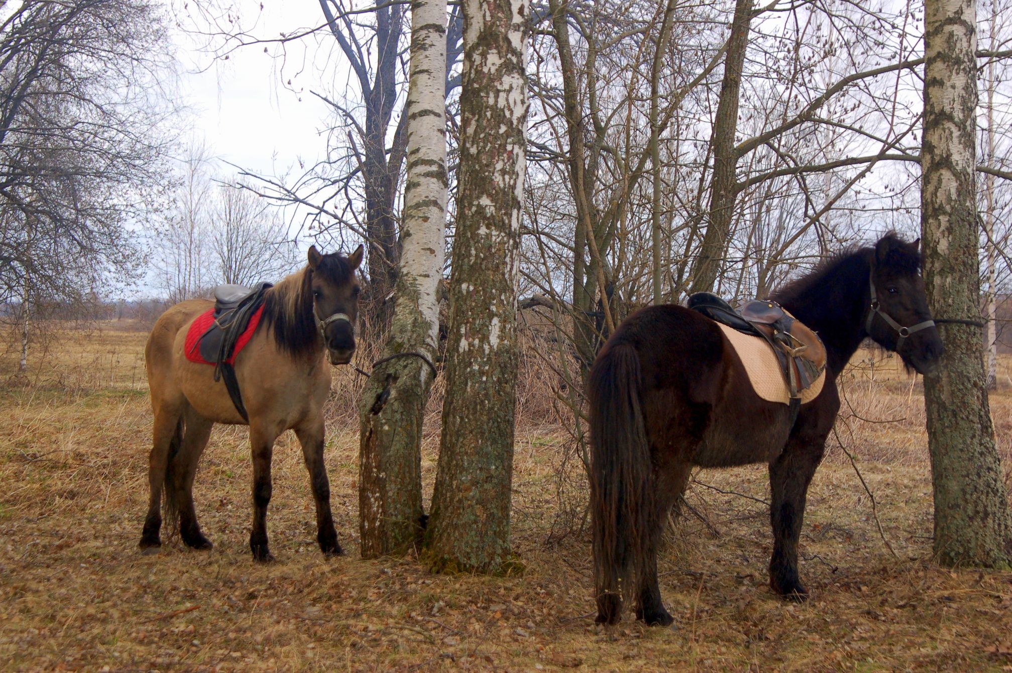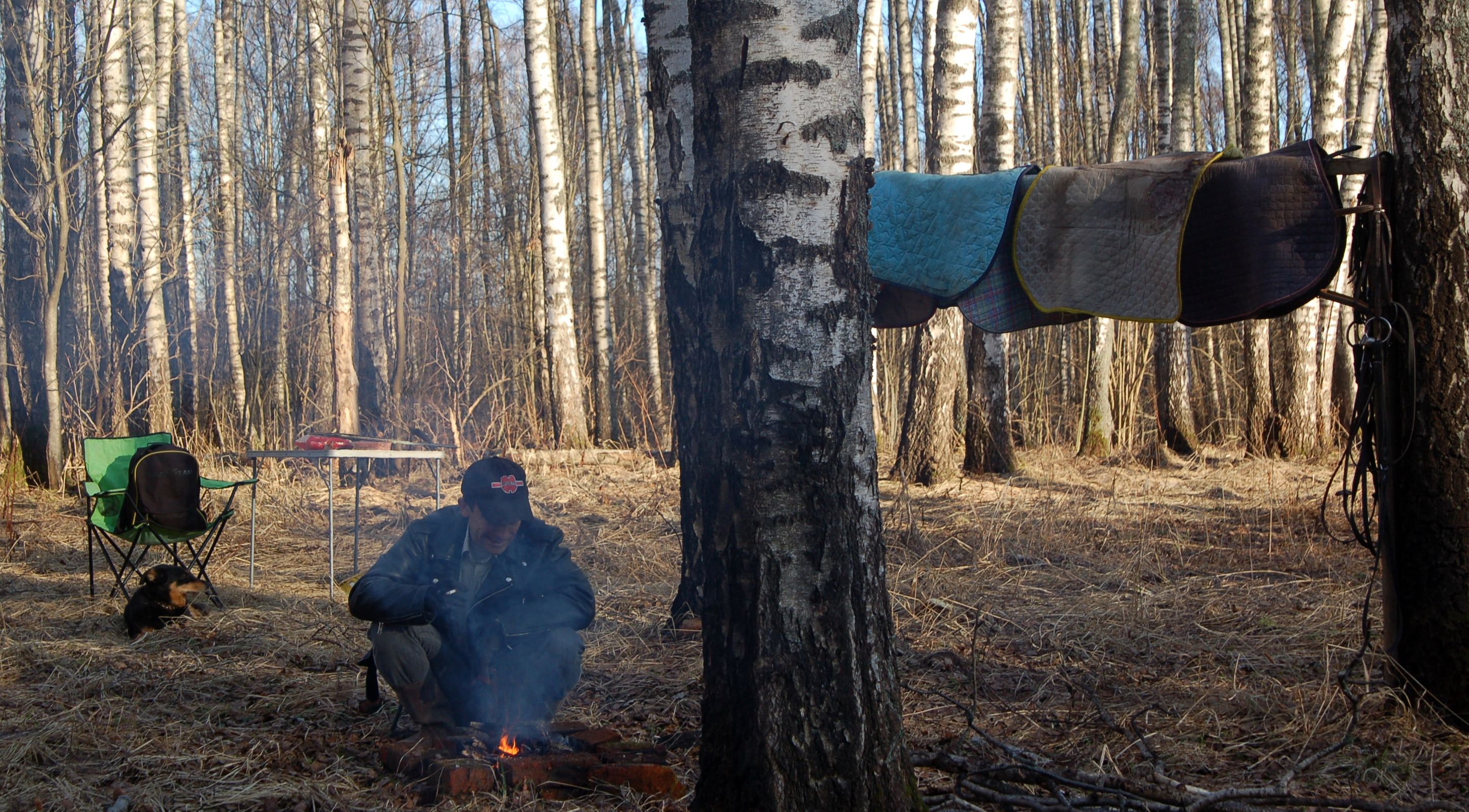 Как прекрасно, что наша любимая берёзовая роща встретила нас как старых и любимых друзей - комаров нет, грунт сухой, дорога проходимая, любимые брёвна для дуракаваляния тоже на месте. И вот, в кострище уже пылает огонь, лошадки мирно щиплют прошлогоднюю листву, а предзакатное солнышко ласково заглядывает на нашу уютную полянку.
