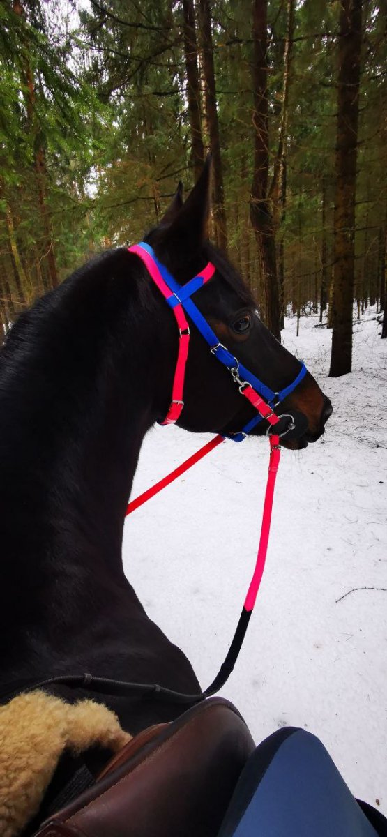 Кожаная прогулочная уздечка из воловьей кожи. Толщина кожи 4 мм. Цвет тёмно-коричневый (в жизни темнее чем на фото). Повод прорезинка, не скользит, широкий (2,5 см), очень удобный. Модель по образу и подобию пробежной.