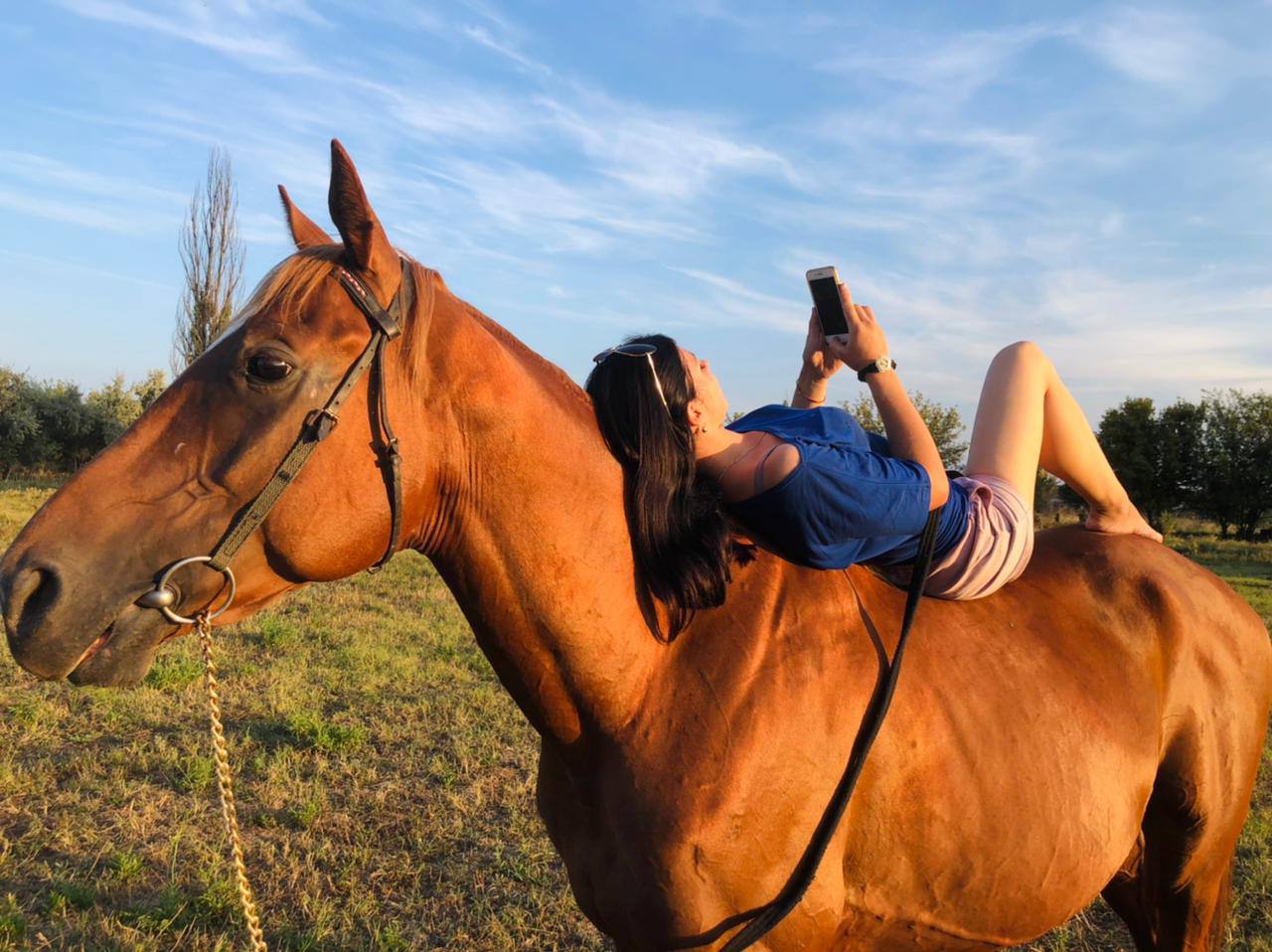 В коневоз идёт как к себе домой, колется и пшикается без вопросов. Расчищается абсолютно спокойно. Умеет пастись на верёвке, не путается.