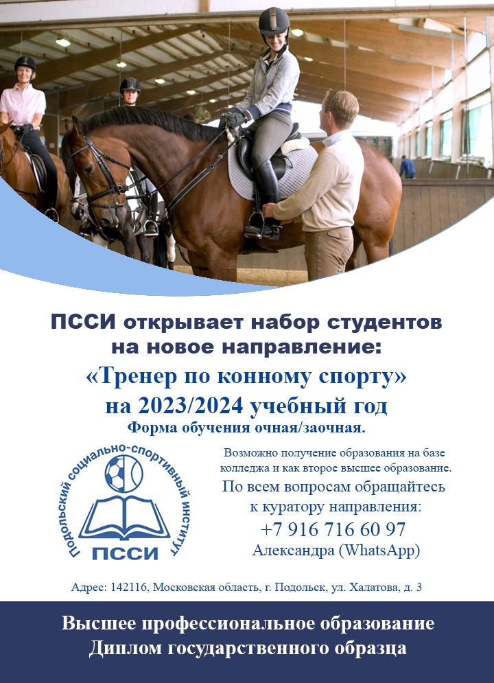 Я являюсь студентом Подольского социального-спортивного института (Московская обл., г. Подольск) на направлении "тренер-преподаватель". И, как действующий всадник-спортсмен, я заинтересована в развитии и продвижении образования в конной сфере. У нас появилась возможность открыть новое направление в нашем образовательном учереждении, а именно "тренер по виду спорта: конный спорт". Что мы получим: диплом высшего образования по специализации. Практика будет проходить в конно-спортивном клубе города Подольска.