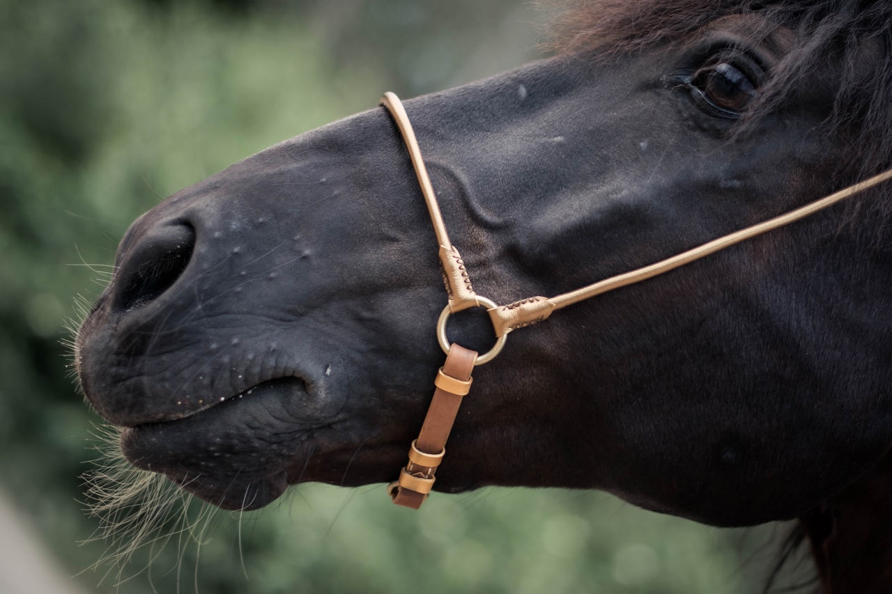 Тонкий и прочный выводной недоуздок бронзового цвета в комплекте с ремешком под челюсть вместо цепи для съёмки на свободе. Без регулировки на затылке. Размер cob - full (суголовный 96,5 см от центра колец, нахрапный 55-64 см). 2100 р.