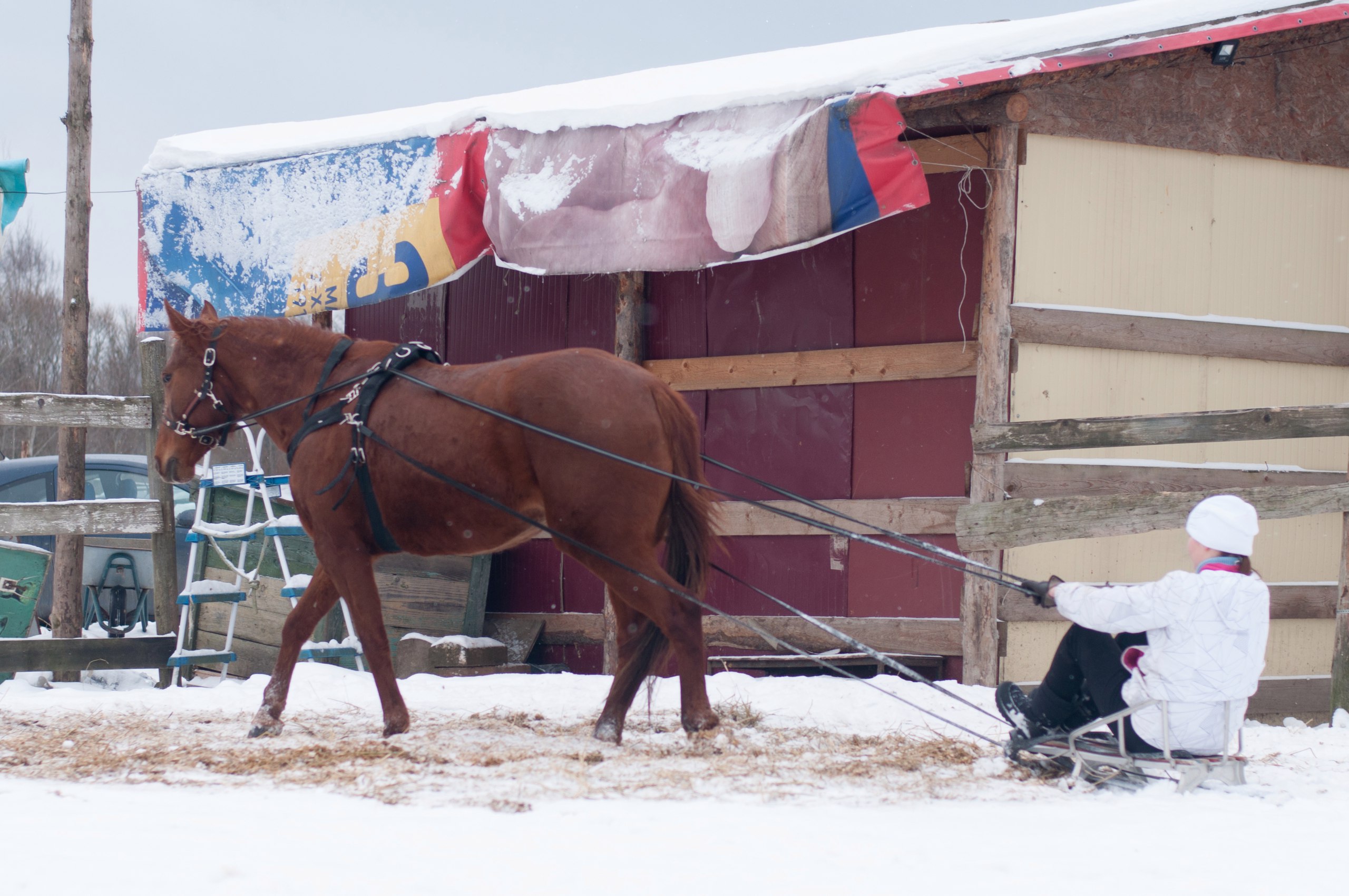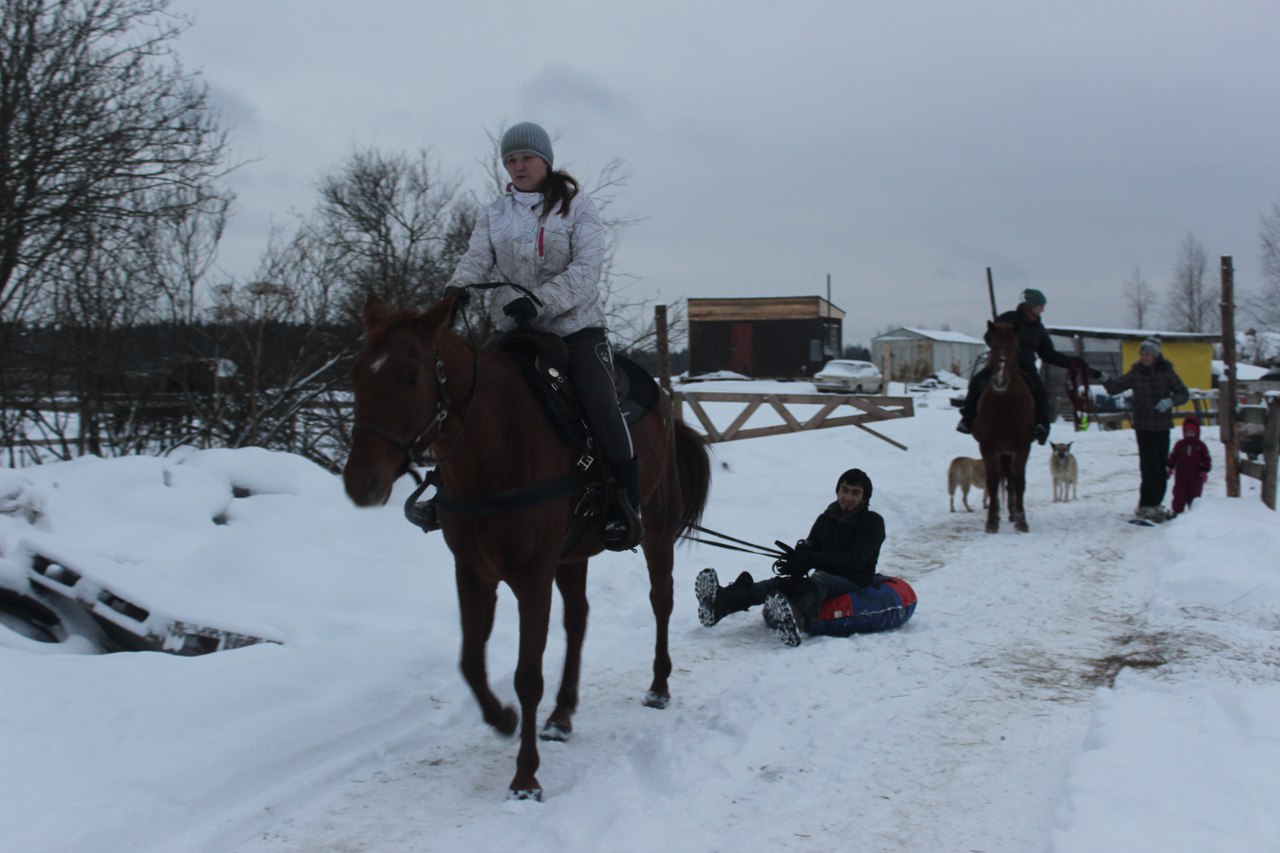 Приехала, нацепила, вывела в манеж. Вместо санок был прицеплен Жора за постромки (заметьте, уже под 80-90 кг весом мальчик!). И тут оказалось, что заезжать Марго совершенно неинтересно, потому что она совершенно очевидно умеет ходить в упряжи. Поначалу тронулась с ленцой, поняла, что Жора тяжелый и профессиональным движением вложилась грудью в шлею. Тянула его с такой силой, будто это пушинка какая-то за ней волочится.