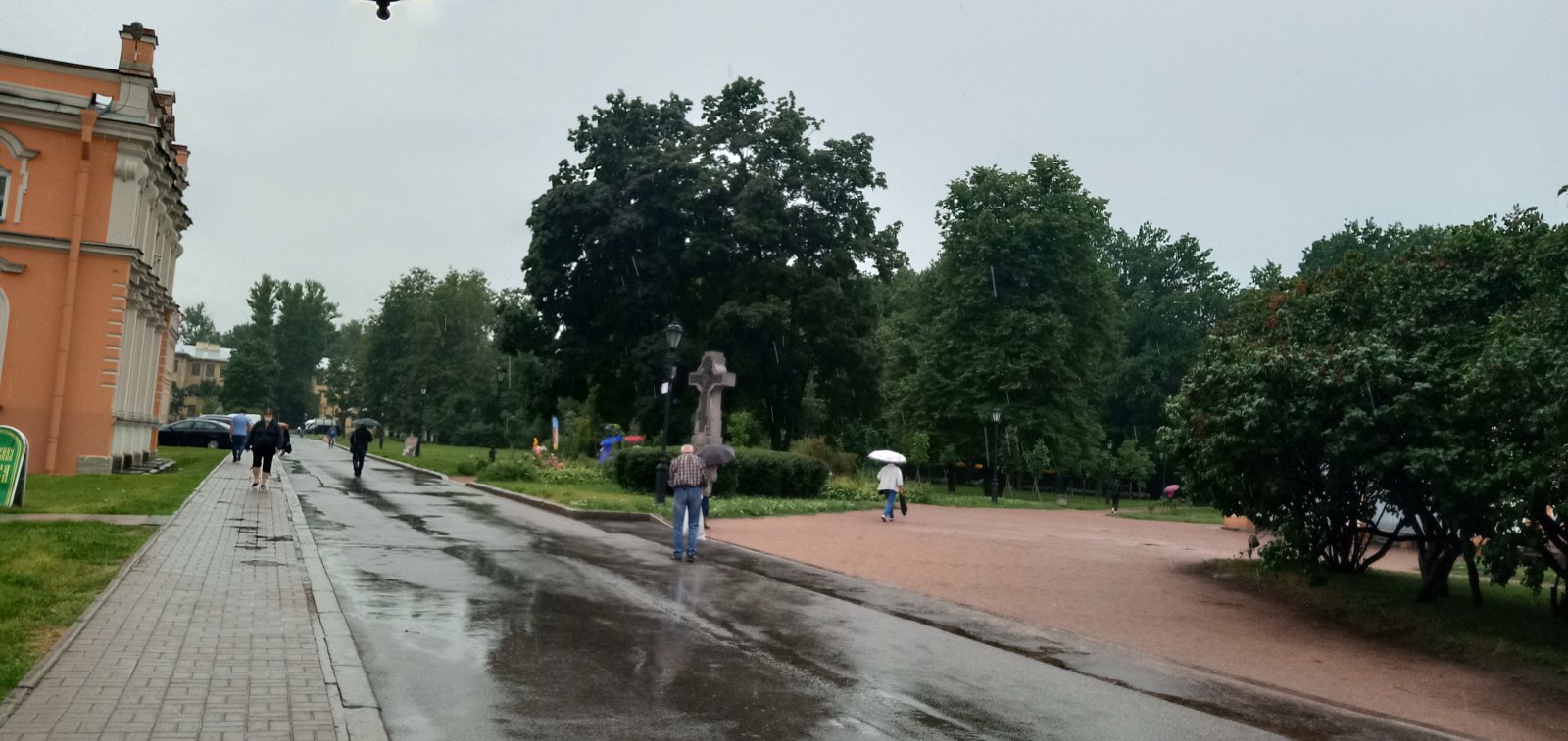 Сад встретил меня тишиной, шелестом дождя и памятником на входе.
