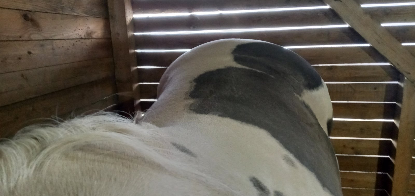 В деннике она пытается отжать меня от ведра с кашей. Просто отодвигает и все)