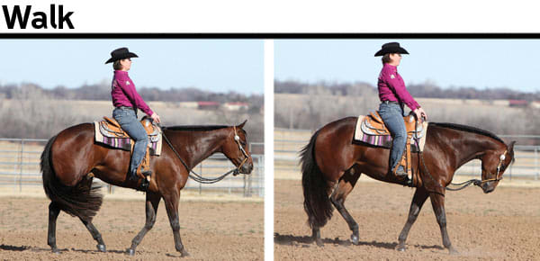 Корректно (слева): здесь всадник демонстрирует свободно-плавный, с захватом пространства, четырехтактный шаг, без неуверенности или задержки в движении вперед. Верхняя линия лошади ровная, эмоциональное состояние позитивное и глаза подняты вверх. Лошадь выглядит заинтересованной.
