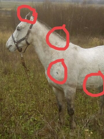 Нету кусочка ушка,яма в шее,от шпор шишка на боку в области подпруги,на плече чёрное пятнышко,натер хомут была травма не большая.В области моклаков две чёрные полоски не большие но приметные.На задних ногах остались болячки от ожегов веревкой.
