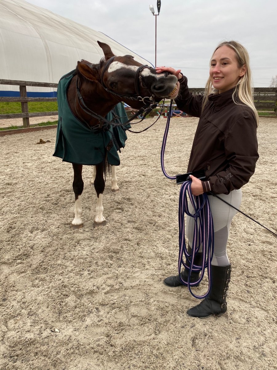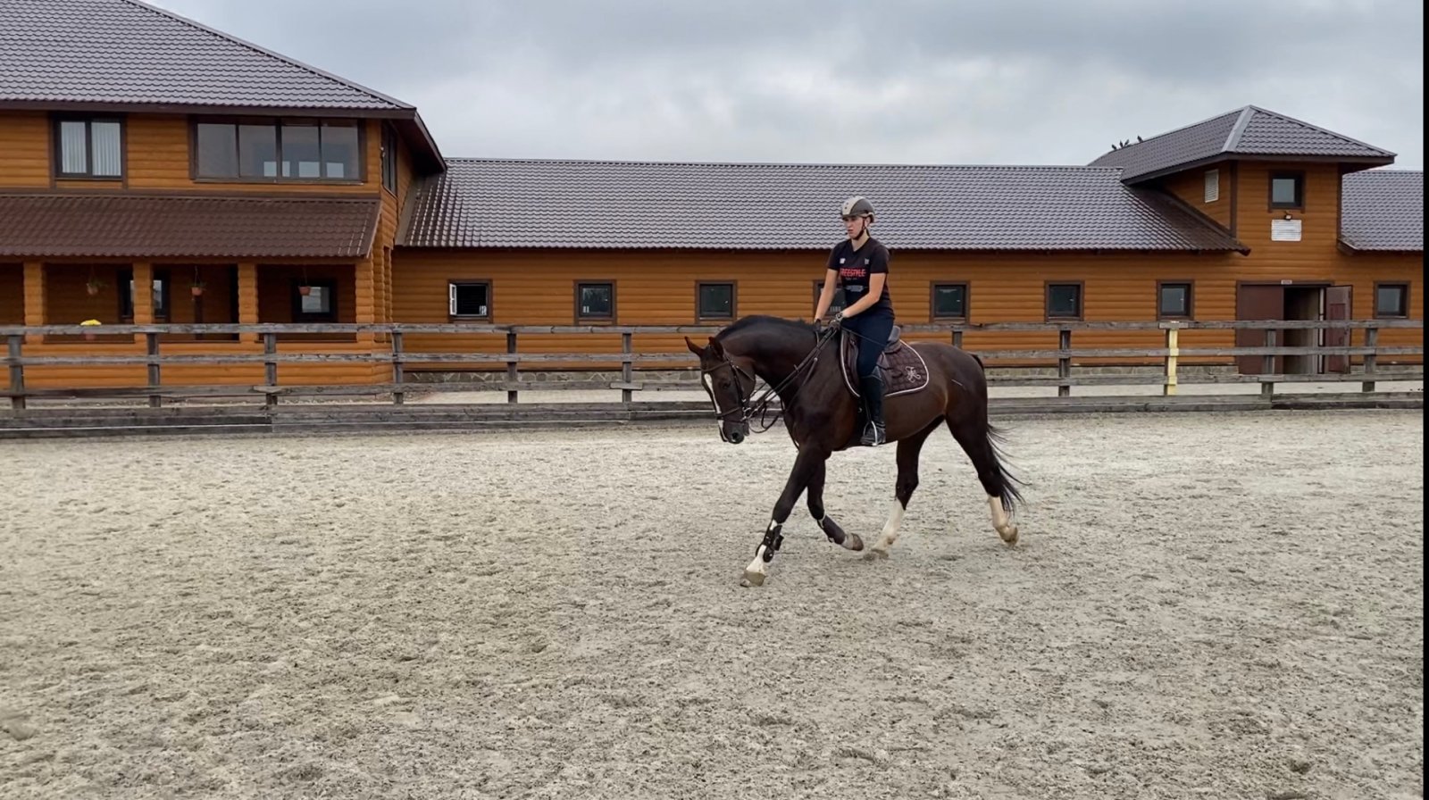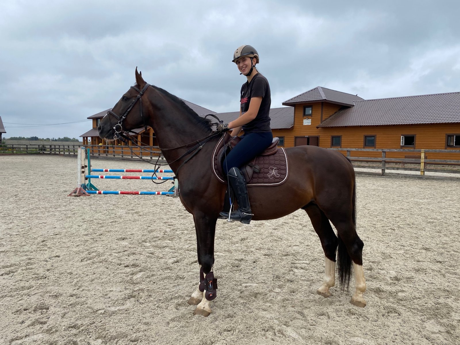 Тренировки будут проходить в КСК Васькино на ганноверском жеребце (165 см в холке). Он спокойный, не свечит, не играет под седлом, общительный. Без проблем работает с другими лошадьми на одной площадке. На препятствие идет спокойно. Не растаскивает ни до, ни после прыжка. Лошадь частная, в прокат не ходит.