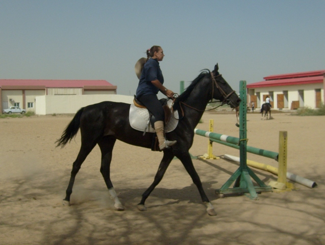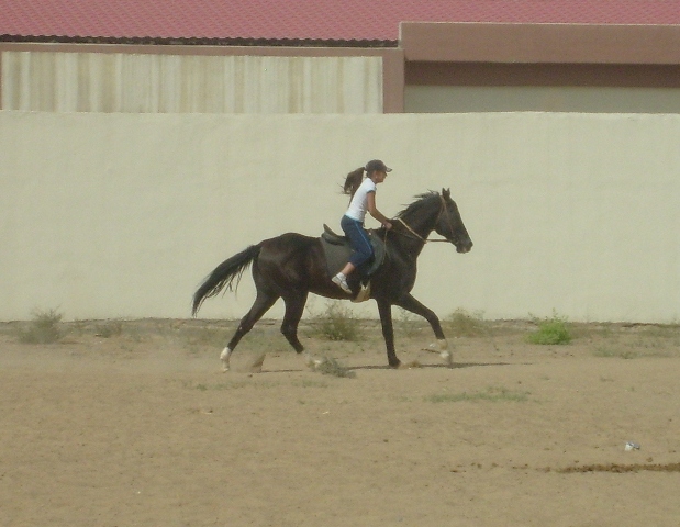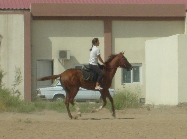 Сегодня. Во-первых, у нас похолодало градусов на 10, что уже само по себе вызвало оживление у конского поголовья. Во-вторых, в субботу и воскресенье лошади не работали. Веселье началось с самого ранья – сначала Камиль носился на корде, пытаясь с нее умчаться вдаль. Потом поседлали и вывели остальных. Я села на Губошлепа, проверить, как он будет после двух дней стояния, вышли Мелесакар и Агуша. Еще на плацу работал газпромовский трехлетка Газачак. Чисто мужская компания. И тут вдруг единственная в нашем карантине кобыла выскочила из денника. Что с нашими мужиками было! Мой начал приплясывать, Газачак распустился, а Мелесакар начал орать и размахивать ногами, так что девчонка на нем очень испугалась. К счастью, кобылу удалось быстро поймать. Но атмосфера наэлектризовалась. Потом вывели Ша без седла. В процессе запрыгивания всадника Ша двинулся рысью, всадник упал, а Ша галопищем ломанулся в сторону левады с кобылами. Парни опять заволновались, мой начал подпрыгивать и подбивать спиной. Правда, ненавязчиво. Агуша ржет, Мелесакар ходит на пружинных ногах. Поймали Ша. Поехали рысью. Бегут, фыркают, ищут повода испугаться. Сзади раздается топот копыт – Газачак заходит на препятствие. Это страшно, надо срочно убегать – Агуша и Губошлеп подрывают, причем Агуша брыкается на манер родео, по словам его всадницы (я не видела). Ша вообще не слушает своего всадника, и все время порывается перейти в галоп. В общем, всем очень весело! Но, к счастью, веселье было недолгим. Через 10 минут рыси нетренированные Агуша и Губошлеп отжигать больше и не думали, так что я с чистой совестью отдала вороного ученице. Спокойная же лошадка!
