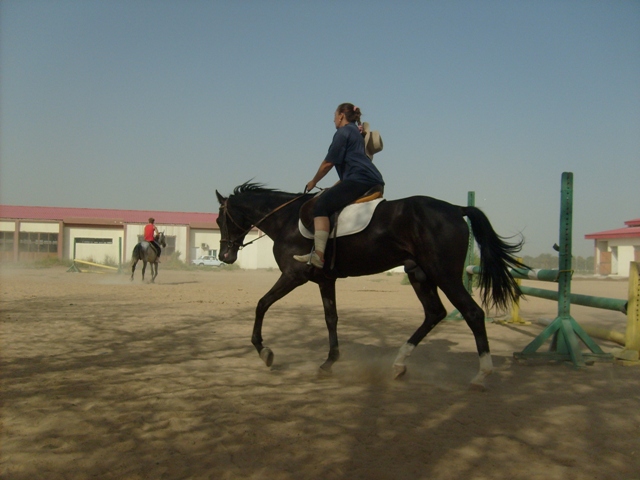 Сегодня. Во-первых, у нас похолодало градусов на 10, что уже само по себе вызвало оживление у конского поголовья. Во-вторых, в субботу и воскресенье лошади не работали. Веселье началось с самого ранья – сначала Камиль носился на корде, пытаясь с нее умчаться вдаль. Потом поседлали и вывели остальных. Я села на Губошлепа, проверить, как он будет после двух дней стояния, вышли Мелесакар и Агуша. Еще на плацу работал газпромовский трехлетка Газачак. Чисто мужская компания. И тут вдруг единственная в нашем карантине кобыла выскочила из денника. Что с нашими мужиками было! Мой начал приплясывать, Газачак распустился, а Мелесакар начал орать и размахивать ногами, так что девчонка на нем очень испугалась. К счастью, кобылу удалось быстро поймать. Но атмосфера наэлектризовалась. Потом вывели Ша без седла. В процессе запрыгивания всадника Ша двинулся рысью, всадник упал, а Ша галопищем ломанулся в сторону левады с кобылами. Парни опять заволновались, мой начал подпрыгивать и подбивать спиной. Правда, ненавязчиво. Агуша ржет, Мелесакар ходит на пружинных ногах. Поймали Ша. Поехали рысью. Бегут, фыркают, ищут повода испугаться. Сзади раздается топот копыт – Газачак заходит на препятствие. Это страшно, надо срочно убегать – Агуша и Губошлеп подрывают, причем Агуша брыкается на манер родео, по словам его всадницы (я не видела). Ша вообще не слушает своего всадника, и все время порывается перейти в галоп. В общем, всем очень весело! Но, к счастью, веселье было недолгим. Через 10 минут рыси нетренированные Агуша и Губошлеп отжигать больше и не думали, так что я с чистой совестью отдала вороного ученице. Спокойная же лошадка!