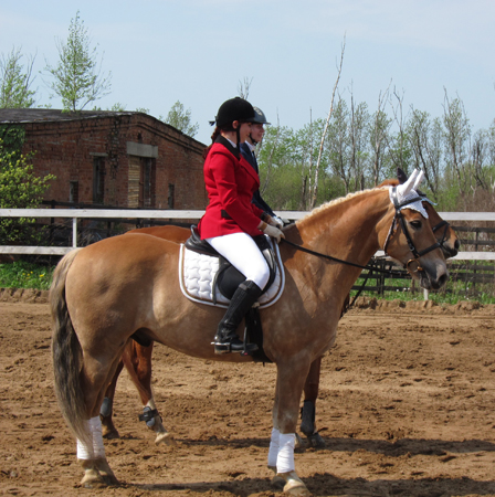 А еще она была самая красивая и эффектная всадница: единственная - в красном рединготе (остальные в черных-серых), на соловом коне с такими шикарными шишечками, на белом с бежевым кантом и фирменной надписью вальтрапе, под ярким, ослепительным солнцем! М-м-мм.
