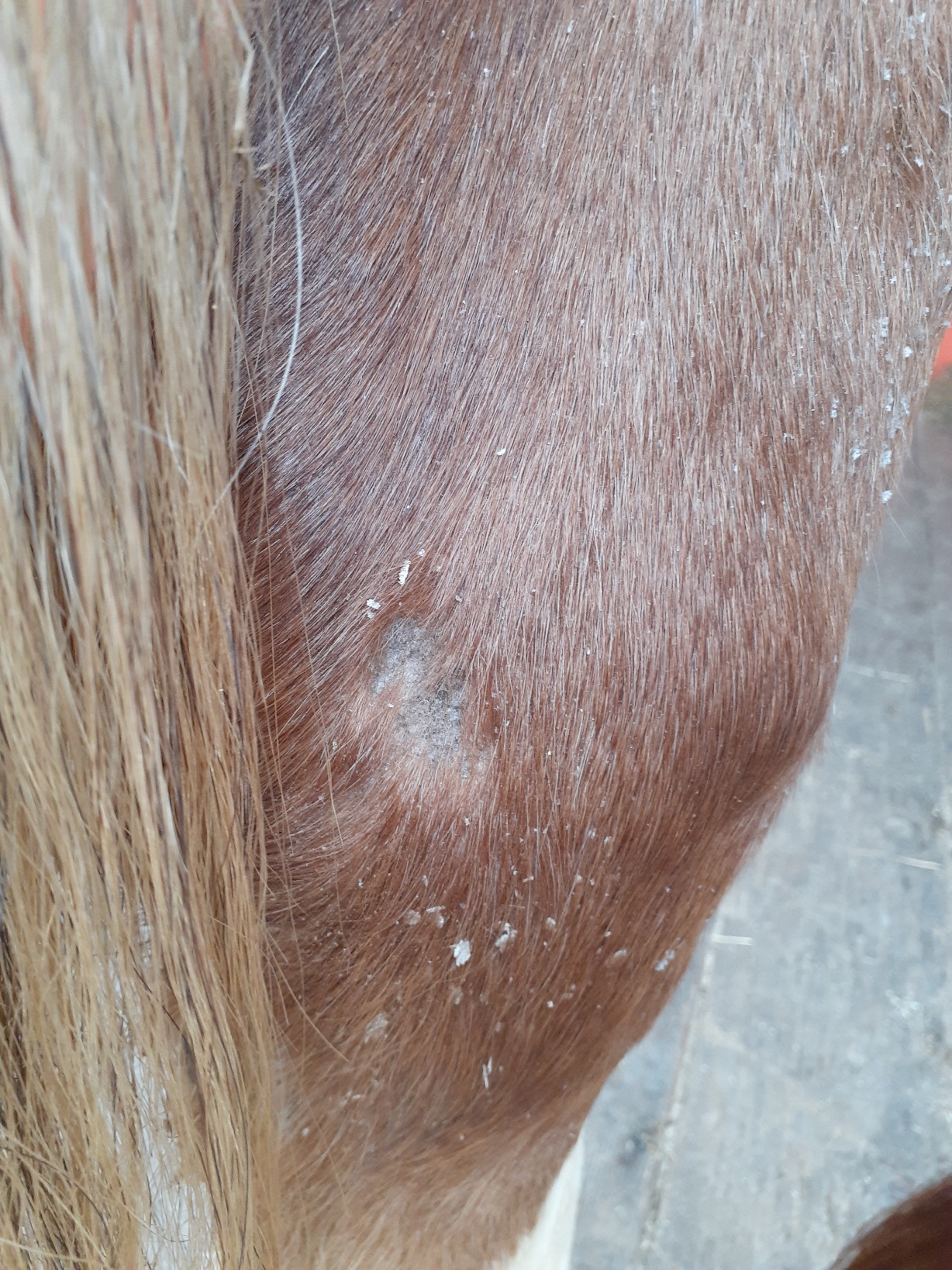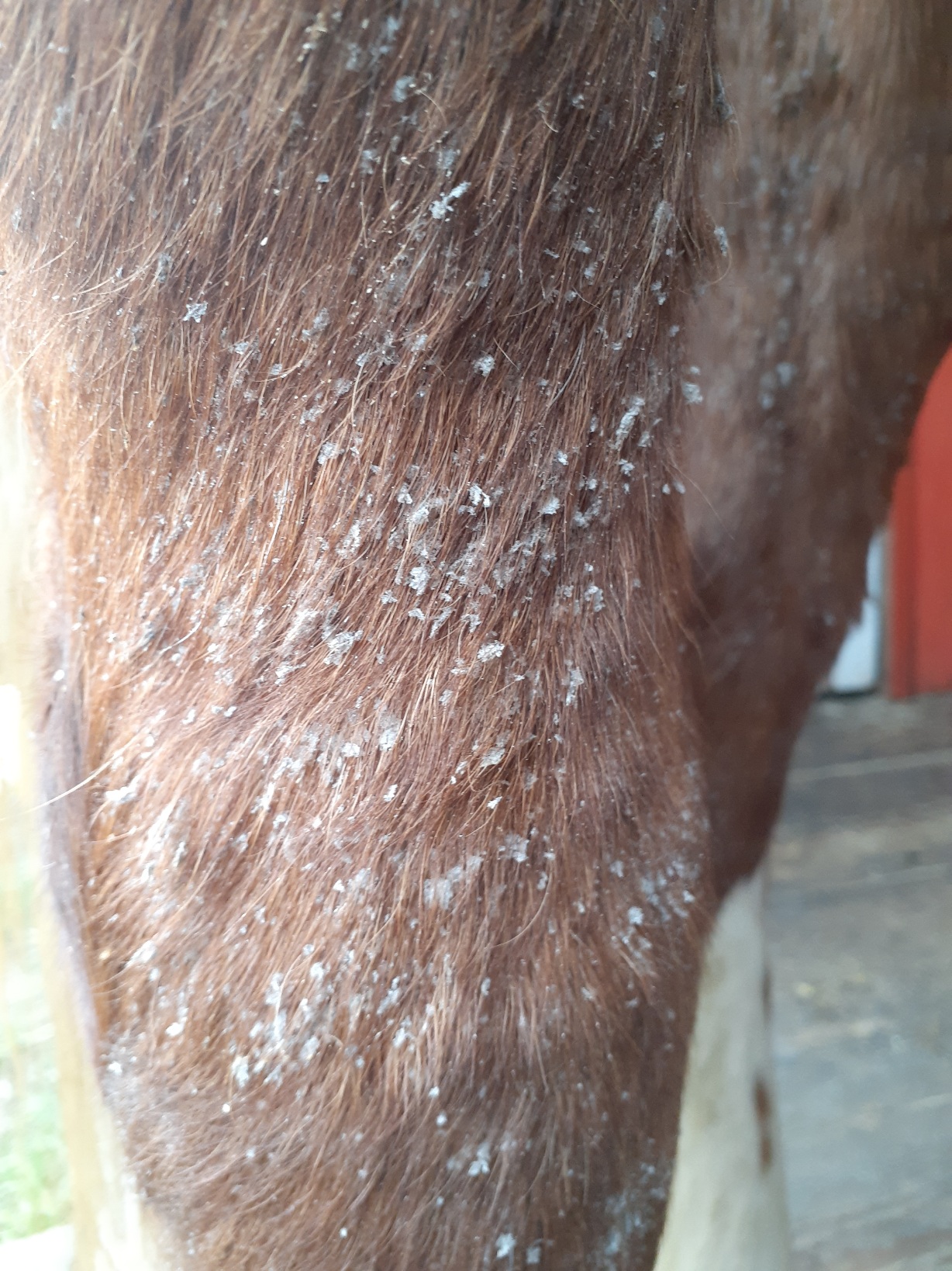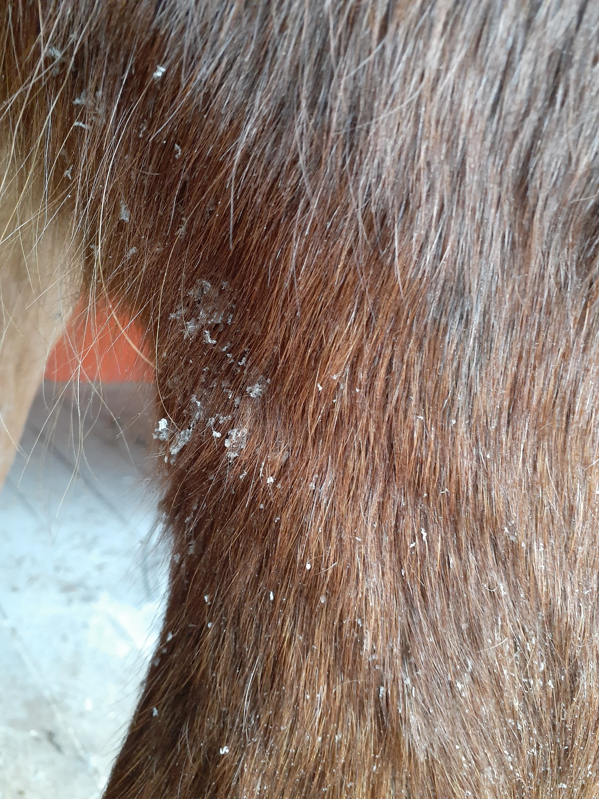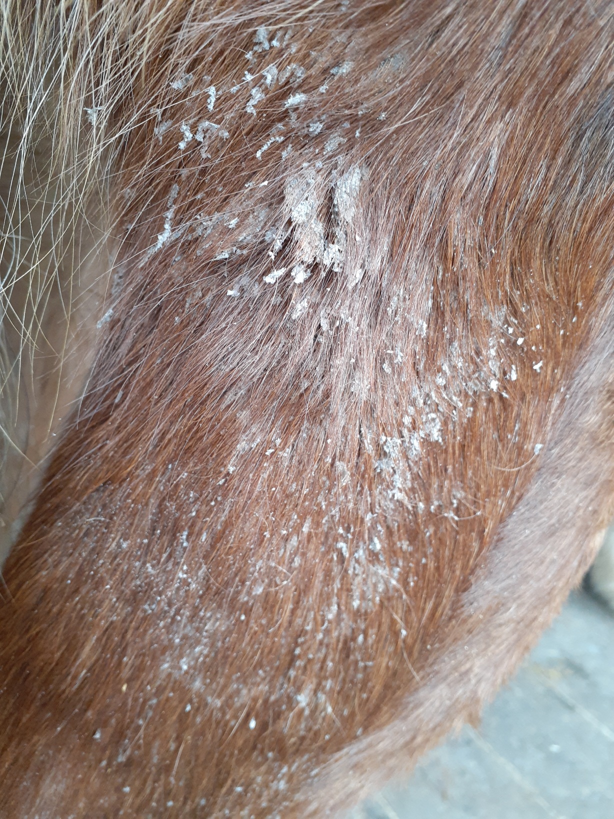 Уважаемые форумчане, подскажите что это такое? Дано: кобыла 4 года, такое наблюдается только на ногах от копыт и до самого верха?? Когда один раз отработали ивермеком, тот прошло, но хватило на полгода примерно... А сейчас опять.. Вроде не чешет.. Выглядит как крупная перхоть.....фото прилагаю....