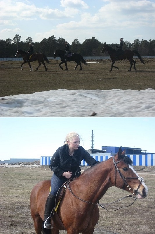 Вчера опять долго напрягала свой "аналитический" ум с целью вычислить свободный манеж. Хотела загнать Певека в шпринт. Но, как обычно, по прибитию я обнаружила тех самых двух частниц, время тренировок с которыми у меня обычно совпадает. На этот случай, кстати, я припасла запасной план. Пока мы собирали коней (у Яны помесь тяжа с рысаком - вороной Торнадо, у Алены гнедой орловец Бэл), мной была предложена совместная вылазка в поля: одной-то скучно, да и в манеже все равно нормально не позаниматься. Там мы решили только размять мальчишек. Разминка получилась очень веселая: Торнадо еле шевелился, Бэл хотел побегать по стенами и по потолку заодним, а Вася, глядя на все происходящее, хотел всего и сразу. Но, тем не менее, со стороны мы выглядели наиболее прилично до тех пор, пока я не завела его на клавиши... Вася решил, что перешагивать все три поочередно неинтересно и вообще это для слабаков, и перемахнул их разом. Три мои попытки завести его как следует потерпеели фиаско. Конь радостно сигал их снова и снова. Ну и ладно. Решила не напрягаться и сделать галопчик. И что же вы думаете? Когда я заводила Певека на вольт на короткой стенке, он подумал, что мы идем опять на клавиши и САМ изменил траекторию. Ну, а дальше по сценарию. Блин, вот честно, я даже не успела сообразить что произошло! Естественно, наказывать не стала и снова завела на вольт, но уже учитывая все варианты