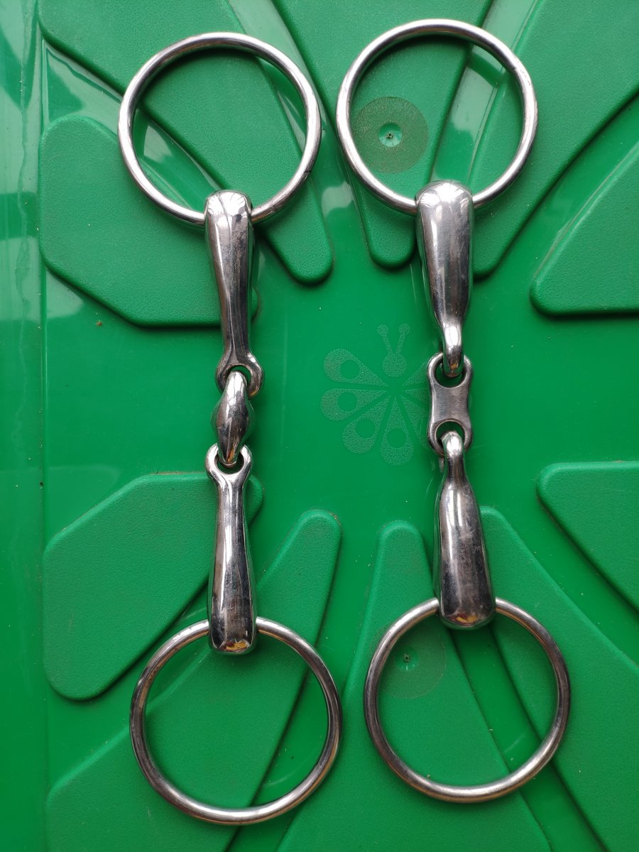 Продам два трензеля, оба 14,5 см. Тот, что с плоской серединой, примерно 20мм толщина грызла. Тот, что с конфеткой - 16мм.