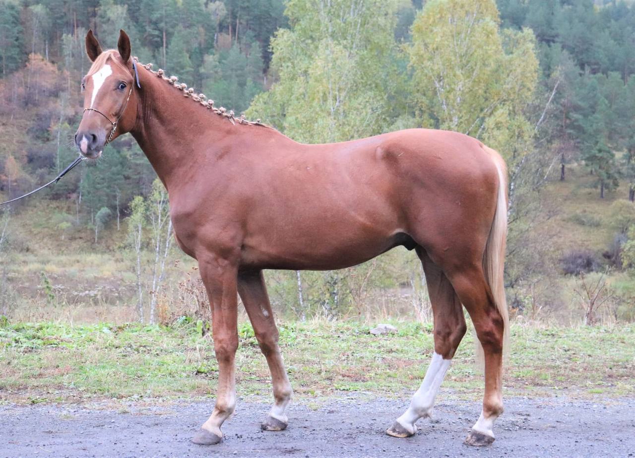 Жеребец полукровной спортивной породы (мама - полукровной спортивной породы, отец - тракененской). Рыжей масти.