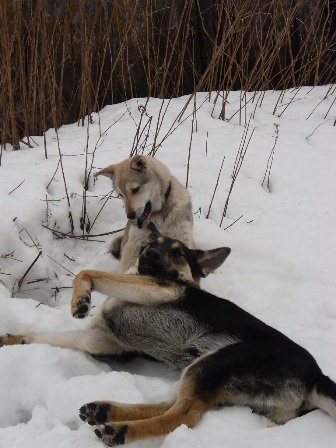 Джек с Гошей играют. Гоша - это щенок лайки, который стал лучшим другом Джека. Джек любит засасывать его голову целиком в свою пасть... :shock: