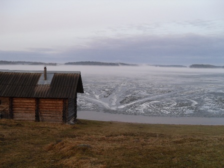 Немного фотографий пустынной, утонувшей в тумане вечерней деревни, отрезанной от цивилизации льдами...