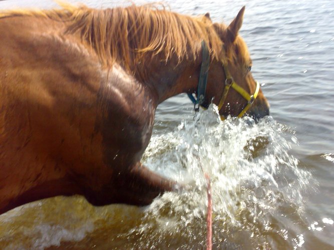 В этом году столько комаров, что в бочке заниматься вообще невозможно! Потому, мы с Марсей занимались ... в воде! Ребенок абсолютно доверяет и бегает по воде туда - сюда, куда указует мой перст, хотя до этого мы вообще никогда не заходили в озеро! Приятно, когда понимаешь, что коню комфортно рядом с тобой... :D