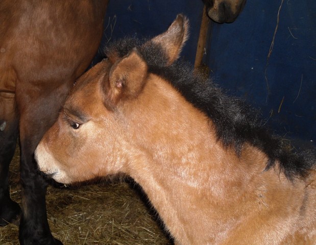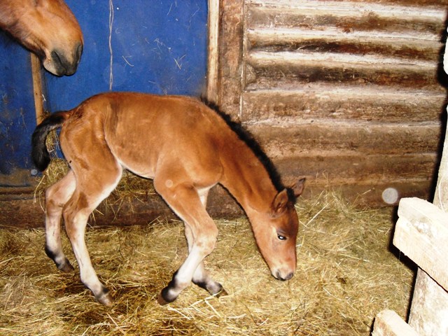 Потом уже были волнения, что ему не встать и не пососать – поили первый раз из сосочки. Опасались и за послед, который подвязали узлом, чтобы кобыла не наступила, но он предательски не отслаивался, хотя в умной литературе написано, что это должно произойти в течении двух часов. Растирали малыша сеном и тряпками потому что в конюшне было прохладно и он дрожал и смотрели, смотрели, смотрели.