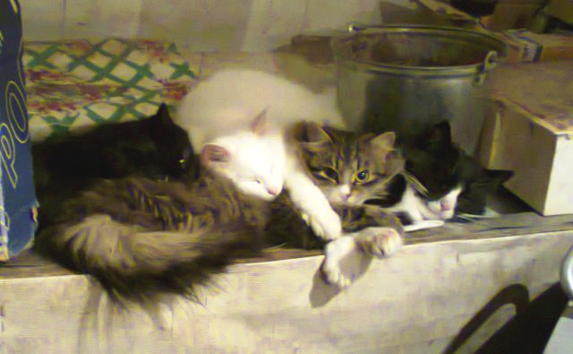 Сегодня нашла всех наших дворовых котов, кошек и котят вот в таком положении: