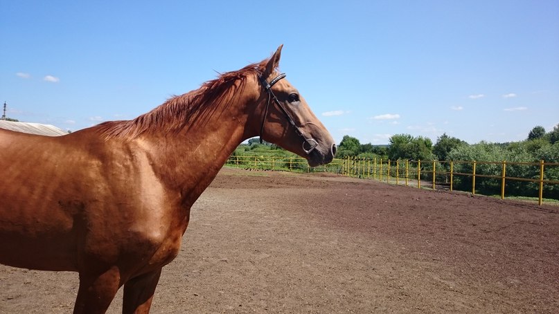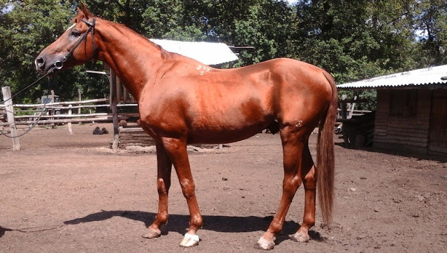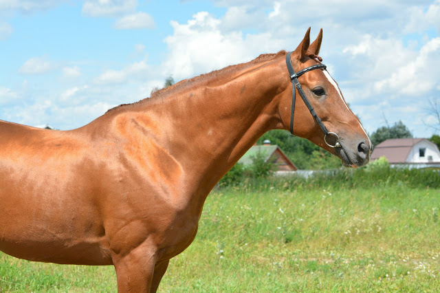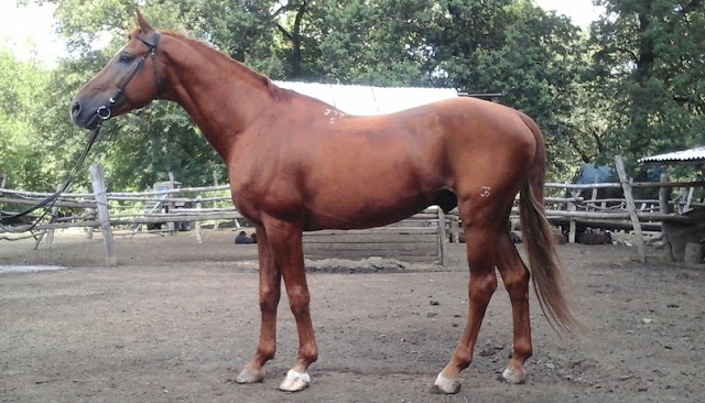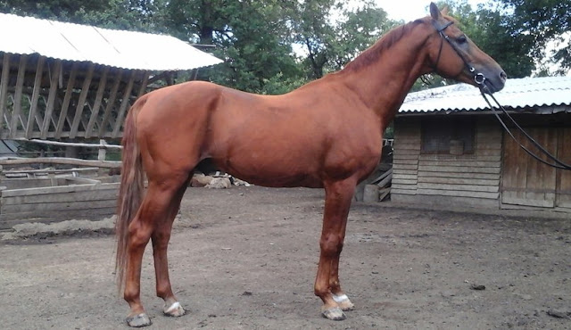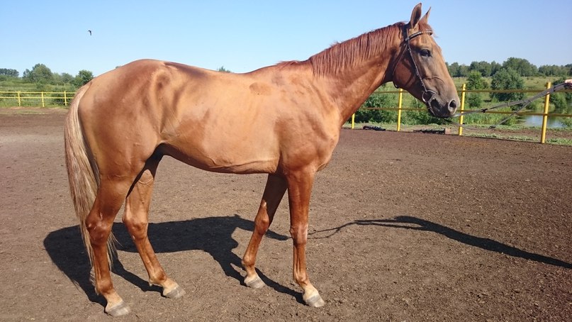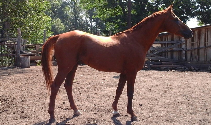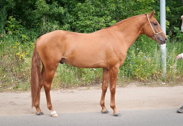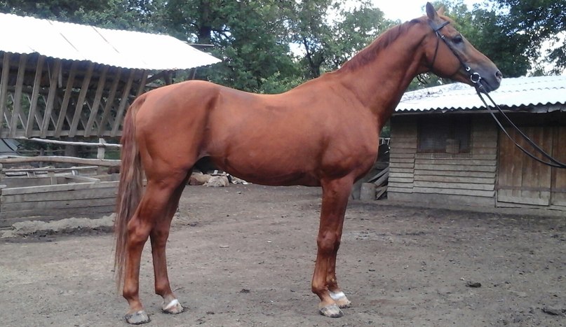 Крепкий, длинных линий. Большая голова, мало затылка, длинная поясница, свислый круп, подхват под запястьем, бедная пясть, пустой.
