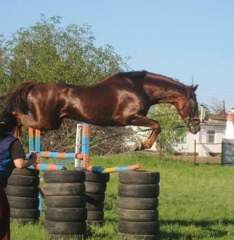 Был заезжен в 4 года. Участвует в пробегах и конкуре ,хотела бы попробовать выездные соревнования по манежной езде.
