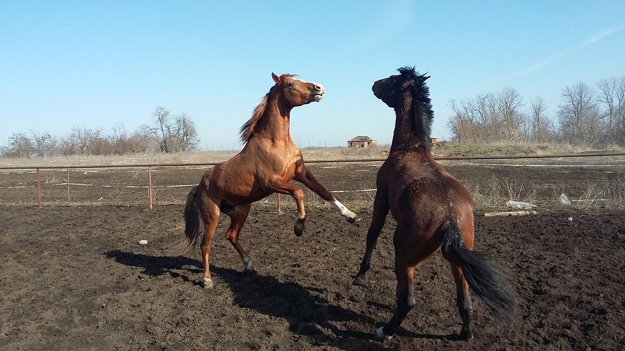 Мы стоим на конюшне, где все в кучу и кобылы и жеребцы. Брант всегда был более чем адекватный с другими лошадями. До двух лет вообще с кобылами спокойно гулял. Его можно с любым жеребцом выпустить от его возраста до намного старше, он со всеми находит общий язык, играет, не дерется.