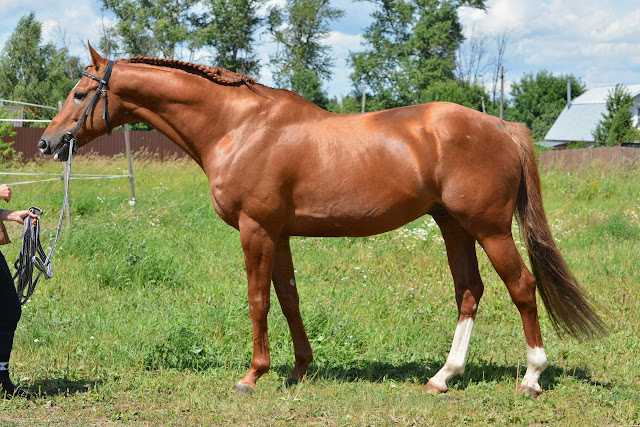 Крепкий, длинных линий. Большая голова, мало затылка, длинная поясница, свислый круп, подхват под запястьем, бедная пясть, пустой.