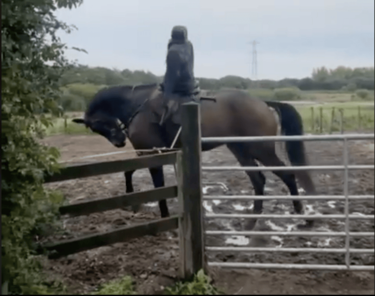 В Великобритании начали расследование жестокого обращения с животными после того, как в интернете появилось видео с лошадью, принадлежащей судье и организатору турниров — Питеру Ходжкинсону. На снятом материале запечатлена поседланная лошадьв леваде с закрепленным манекеном всадника на спине и туго затянутыми развязками.